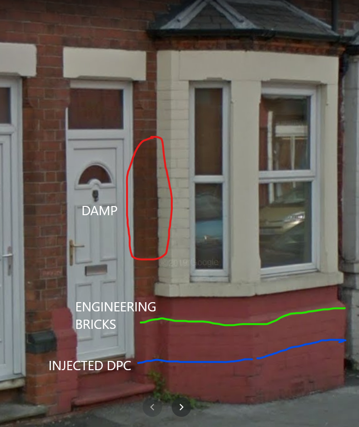3. When I looked back on google maps I noticed this patch has been discolored as far back as Aug 2018 (last time google updated our street), see pic, but the internal wall only recently showed any sign of damp.
