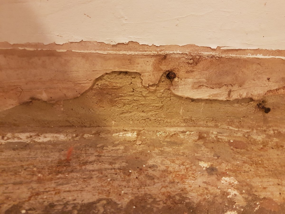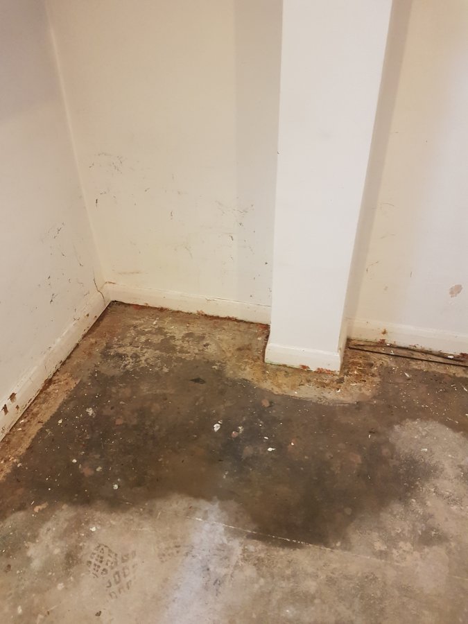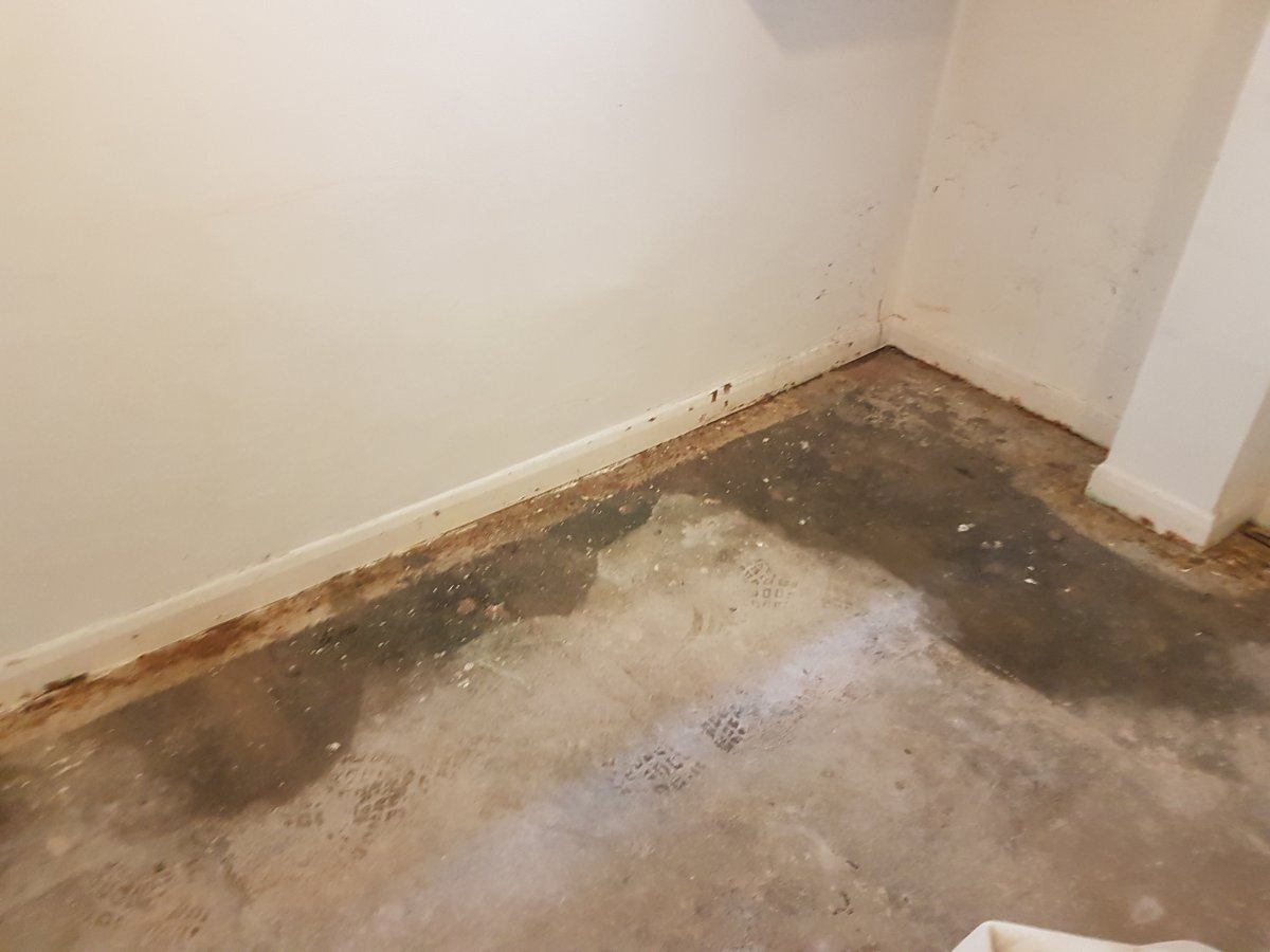 I have a basement which is below ground level on the 2 external walls. These walls were re-tanked about 15 years ago and no obvious moisture has come in since then. After having a musty, damp smell I lifted the carpets and there are now damp patches on the concrete floor ( please see pics ). I have put a damp meter on the 'dry' spots on the floor well away from the walls and the meter still shows dampness, and where the obvious damp patches are next the the outside walls damp is showing on the meter up to about 30cm above floor level, but not much above that. The property was built in about 1900. Any advice o how to treat this problem, I was wondering whether trying the concrete with a de-humidifier first then applying something like https://www.kingfisheruk.com/epoxy_primer-item-70 would help?