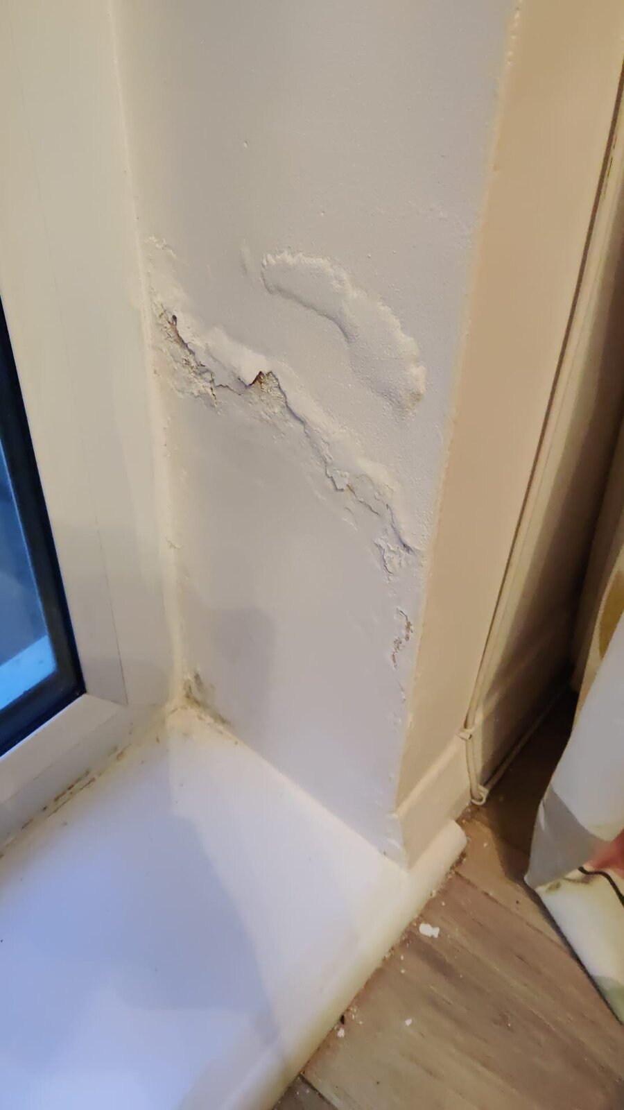 We moved in October 2022 and a damp patch has come up in the bottom right corner of our backdoor aperture, there is discoloration and the plaster has blown.