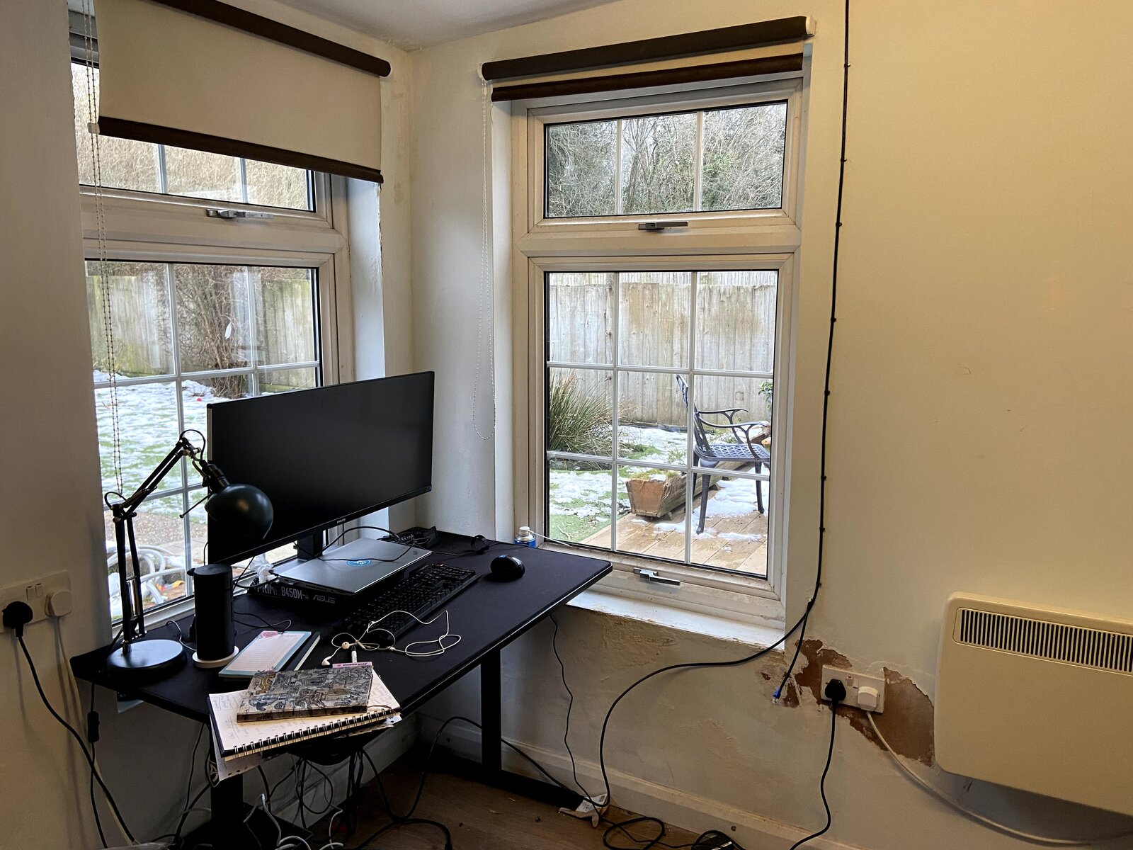I am keen to use the this outbuilding as an office too - it looks solid and pretty new with proper corrugated roof , double glazing windows/doors, electricity+heaters, and even a bell that rings ( insancely loud) when someone uses a main bell at the front door.