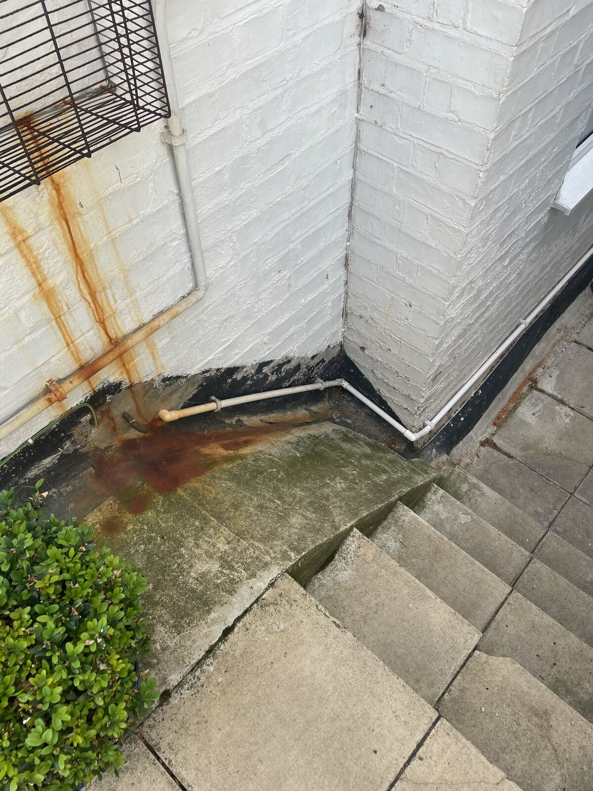 I'm currently suffering with an external damp issue which is being caused by a concrete slope which runs parallel to some stairs. (see attached photo). Everytime it rains, rainwater runs down the slope and into the wall.