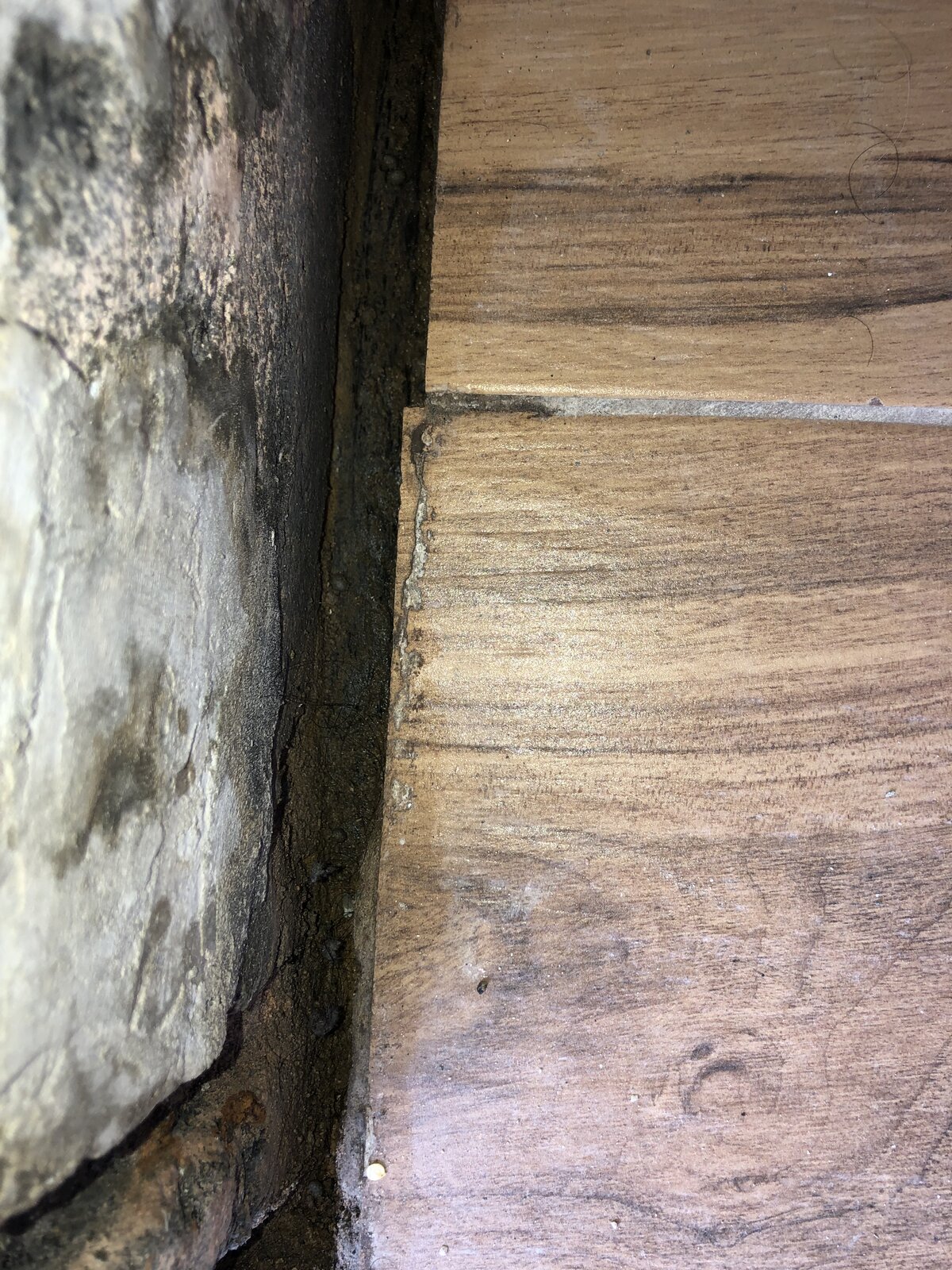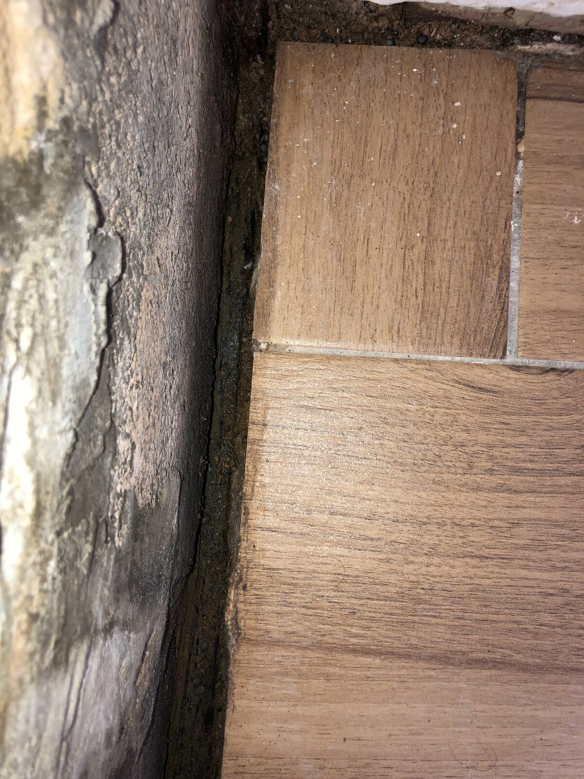 I can't see any moisture or dampness on the wall now without plastering that section. But, I noticed that there is a small water ingress issue in the corner of the floor (it is a tile floor on top of the concrete floor ). I can also see that the Black Damp Proof membrane is not completely covered throughout (I think the width is not enough DPM). I would like to get your opinion to fix this moisture issue in the corner without redoing the floor area around that corner.
