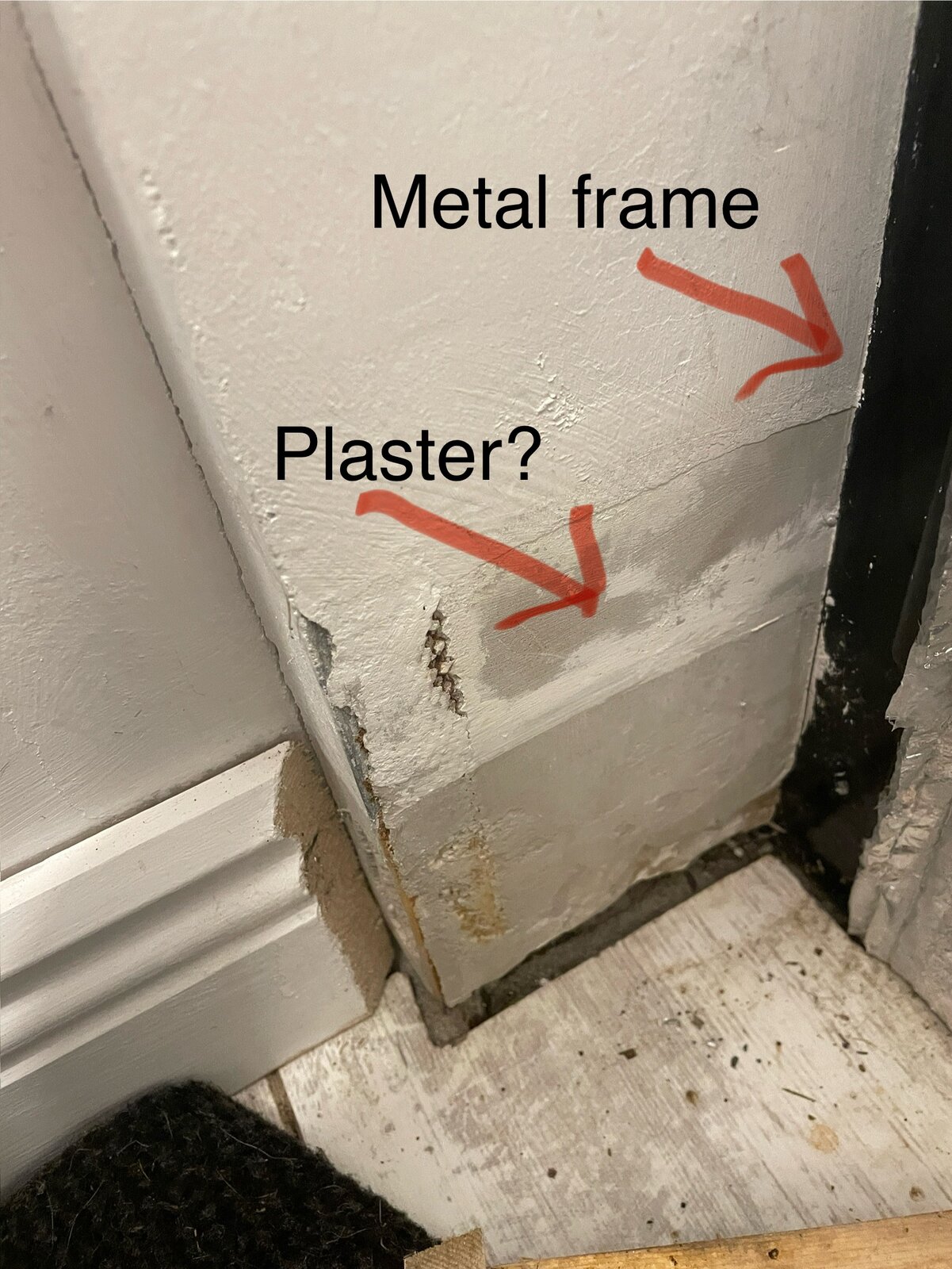 Have any of you seen anything like this and have any advice? Should I try to remove the "plaster" (if it is plaster) and corner bead? Or it is too much for a DIY job? I'm also considering changing that metal door anyway (since it is always cold).