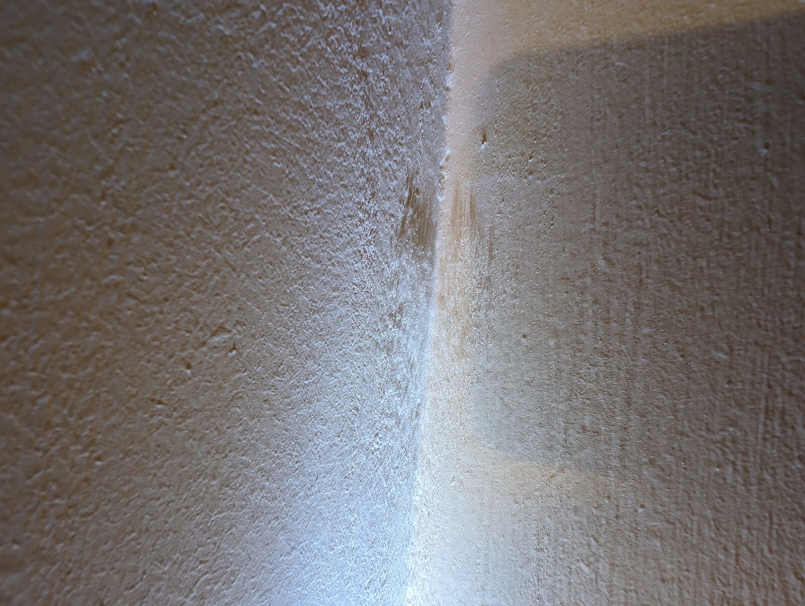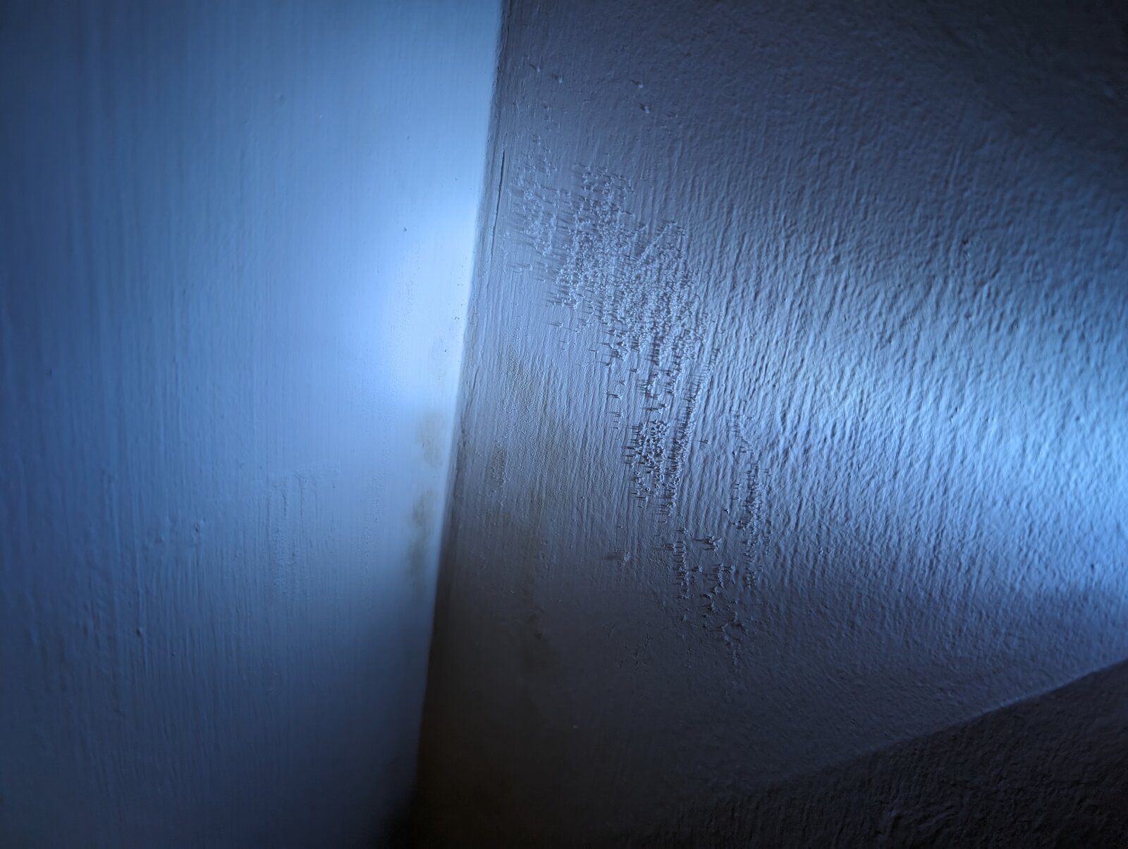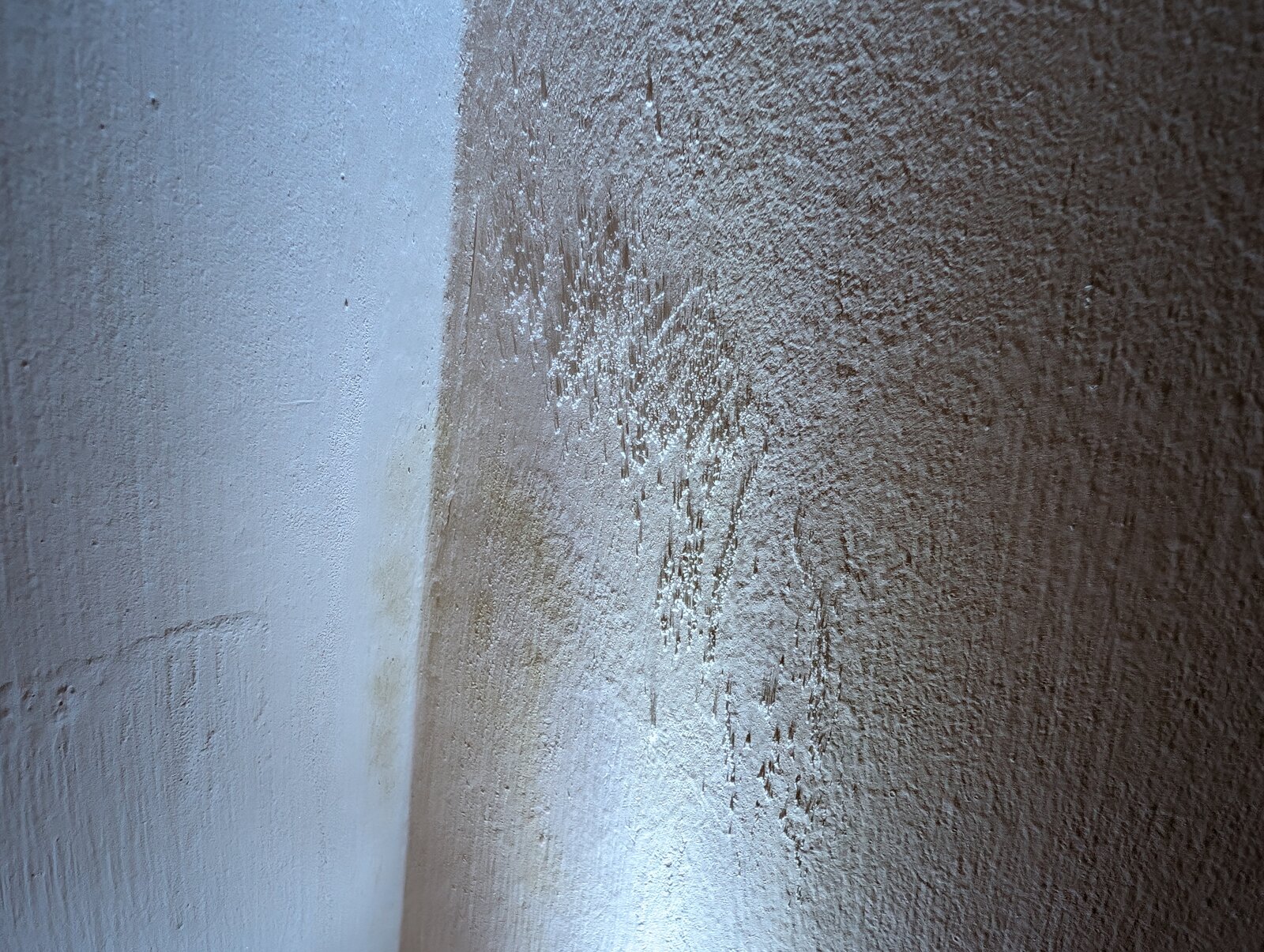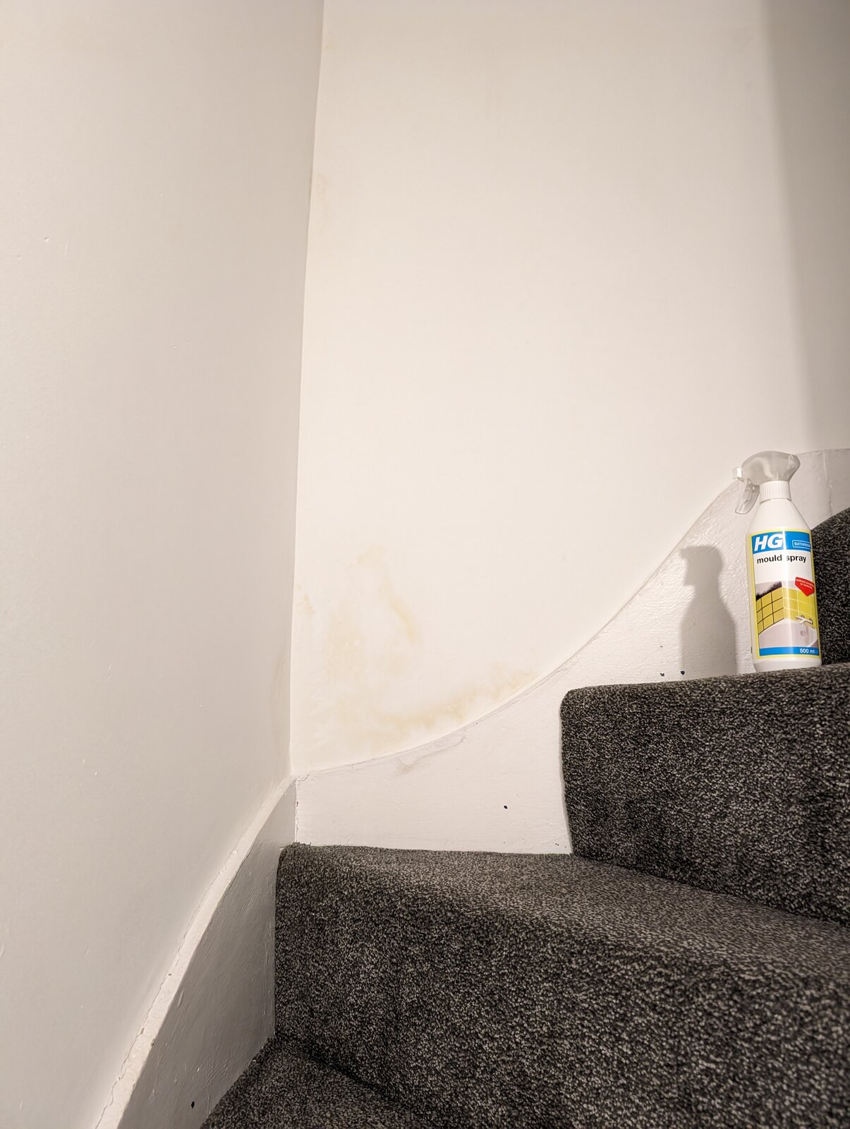 Due to the recent deluge of rain and wind in the UK, I had some guttering overflowing in a corner and running down the wall. This got in through cracks/etc and seeped across the cavity to the inside, through to the plaster on my stairs creating some damp patches on the wall.