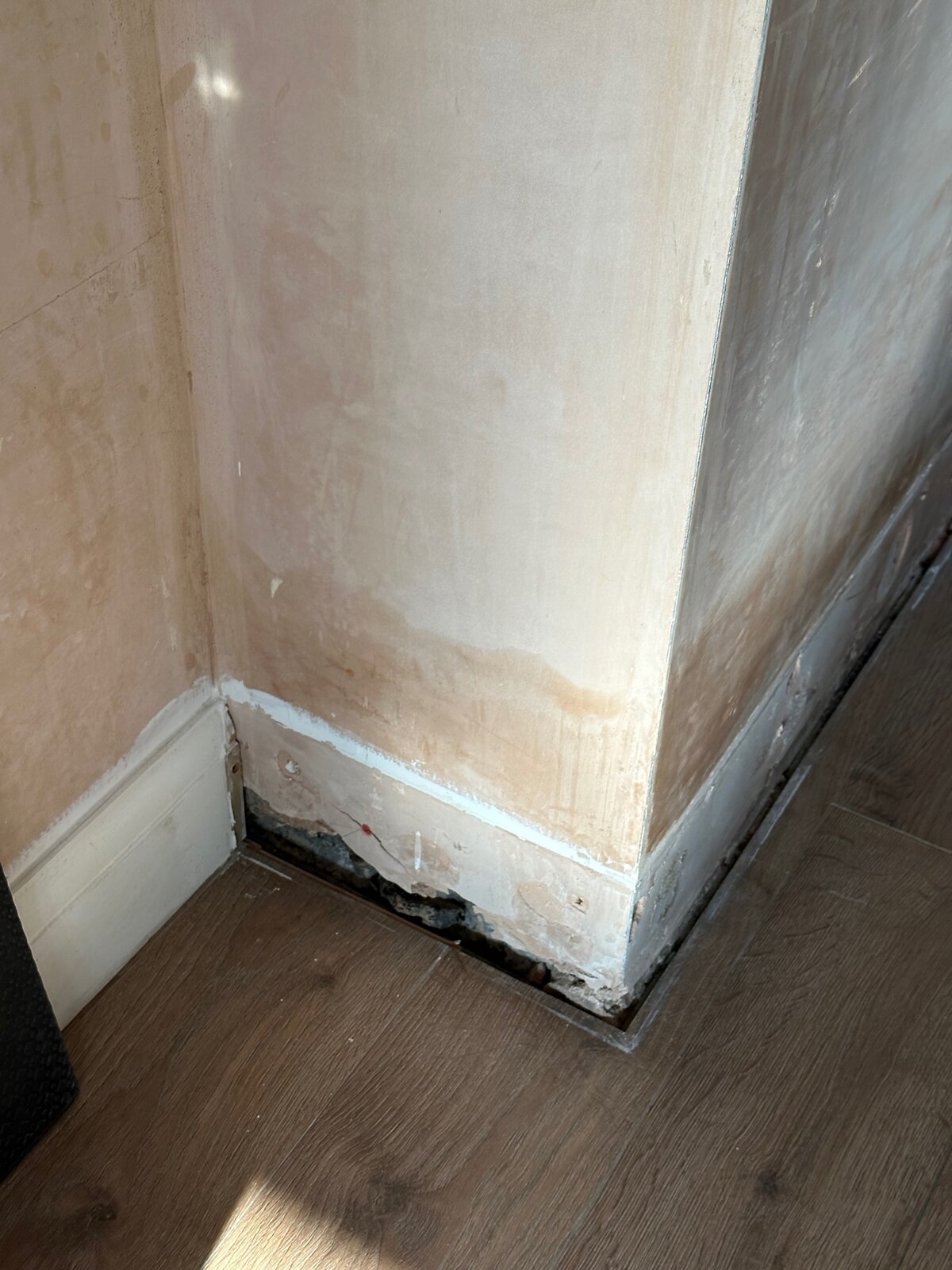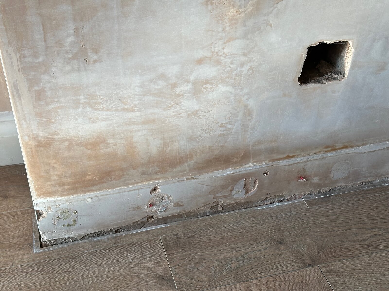 I’m in the process of painting and decorating downstairs and have noticed this damp patch on the chimney breast. The wall used to be covered with wallpaper, and a few months ago, I stripped the wallpaper and had the wall re-skimmed.