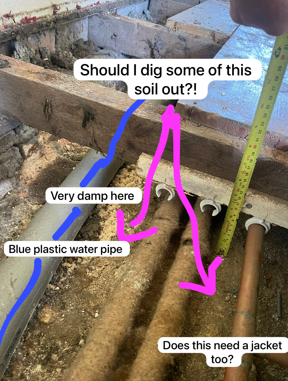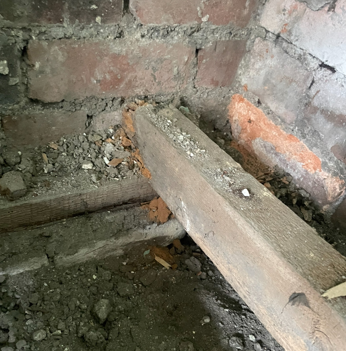 Third pic is in the dining room on the ground floor on the side of the roof leak. The wall is damp and needs to go back to brick. The soil is pretty raised and very damp in places - I'm not sure if this is from the roof leak or otherwise I've checked inside the foam insulation of the water pipe running through and it doesn't seem to be wet. The timber running parallel to the wall supporting the joists isn't dry.