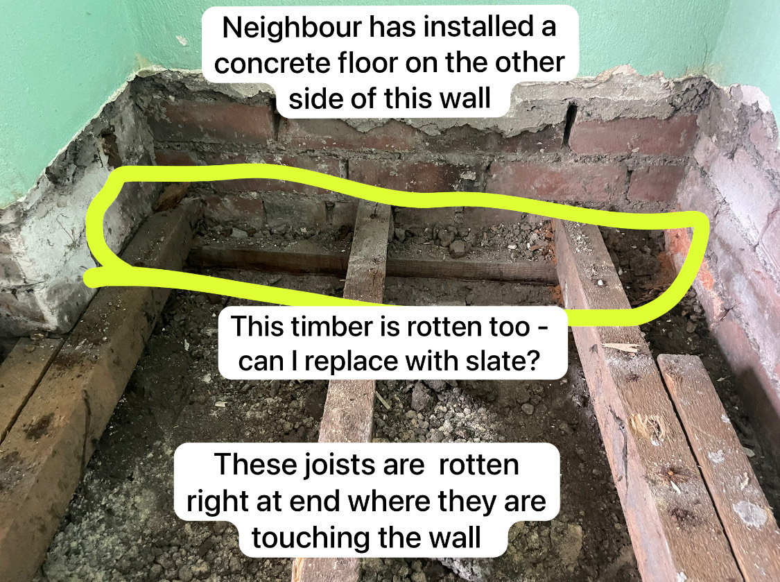 Ideas so far: Cut off the rotten ends of the joists. Screw or bolt new timber the the good bit. At the wall remove the rotten parallel support timber by the wall perhaps replace with slate. Put some DPC around the end of the new timber joists.