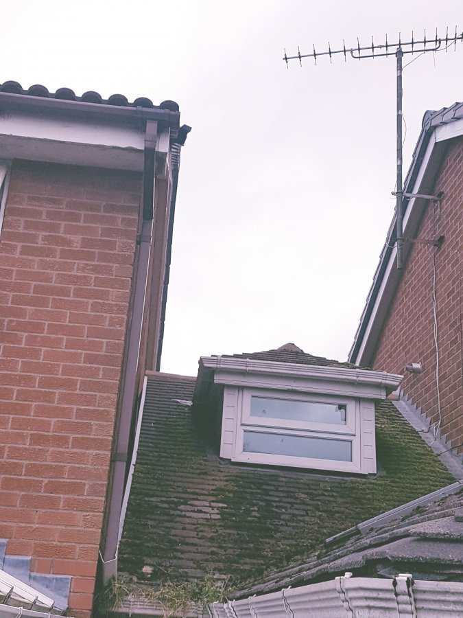 On the outside picture you can see our neighbours house (with their lovely kept roof) is in a sorry state. However where their downspout is, not near where the damp is i.e. at least a metre away.