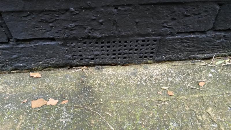 Outside, the wall is South-facing with a narrow alley way to the back yard. There is an air brick right underneath the centre of the window and I believe that this may be the cause. As you can see in the photo below, the concrete pathway outside has been laid right up to the level of the bottom of the air brick so any standing water is almost certainly entering the floor void through the air brick.