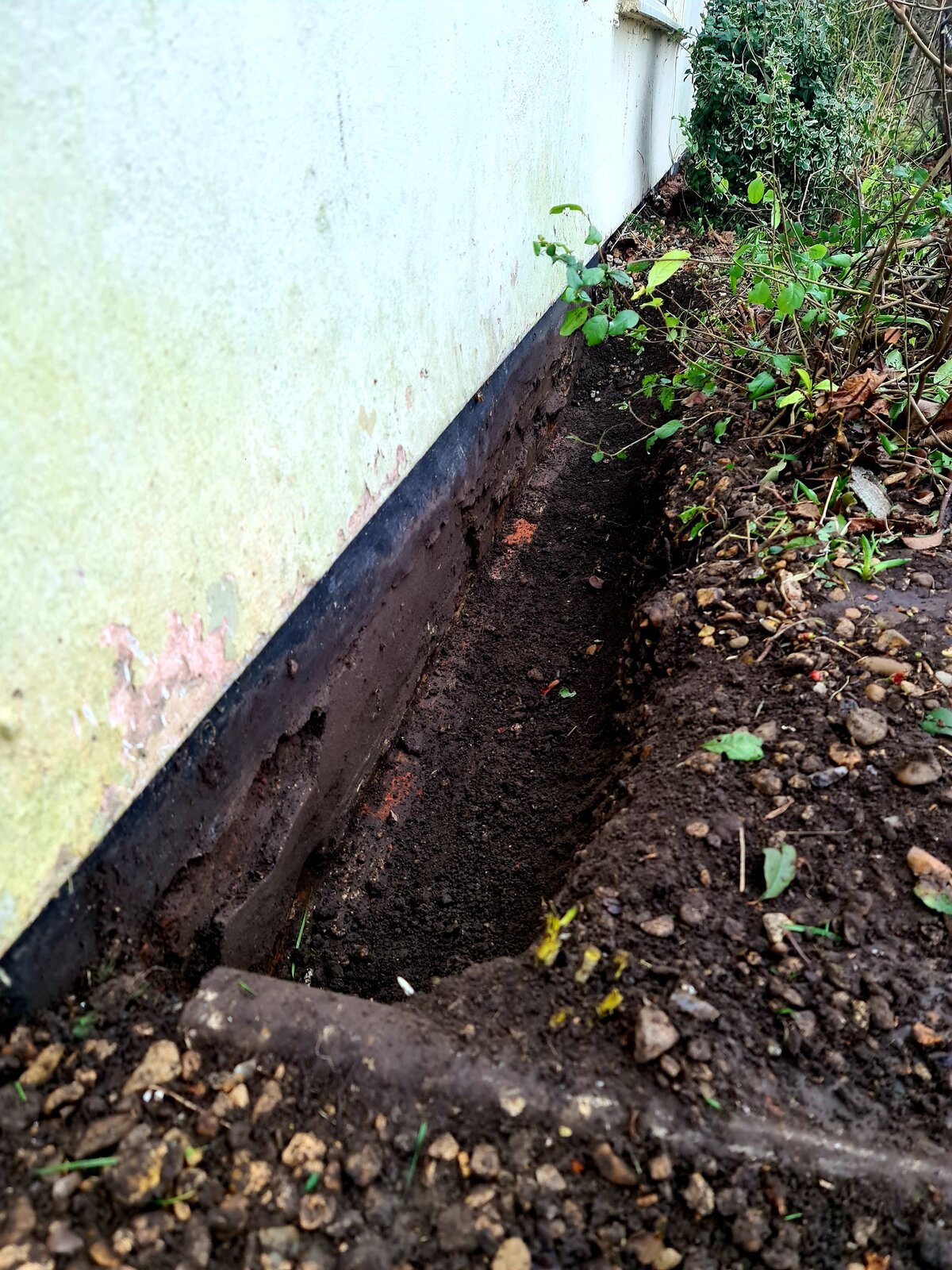 Right now we are trying to sort out some 'rising damp' along the front wall of the property. There is what appears to be a very old attempt at sorting it out, a gulley filled with gravel, although it doesn't drain to anywhere and it's now mostly soil rather than free draining gravel.