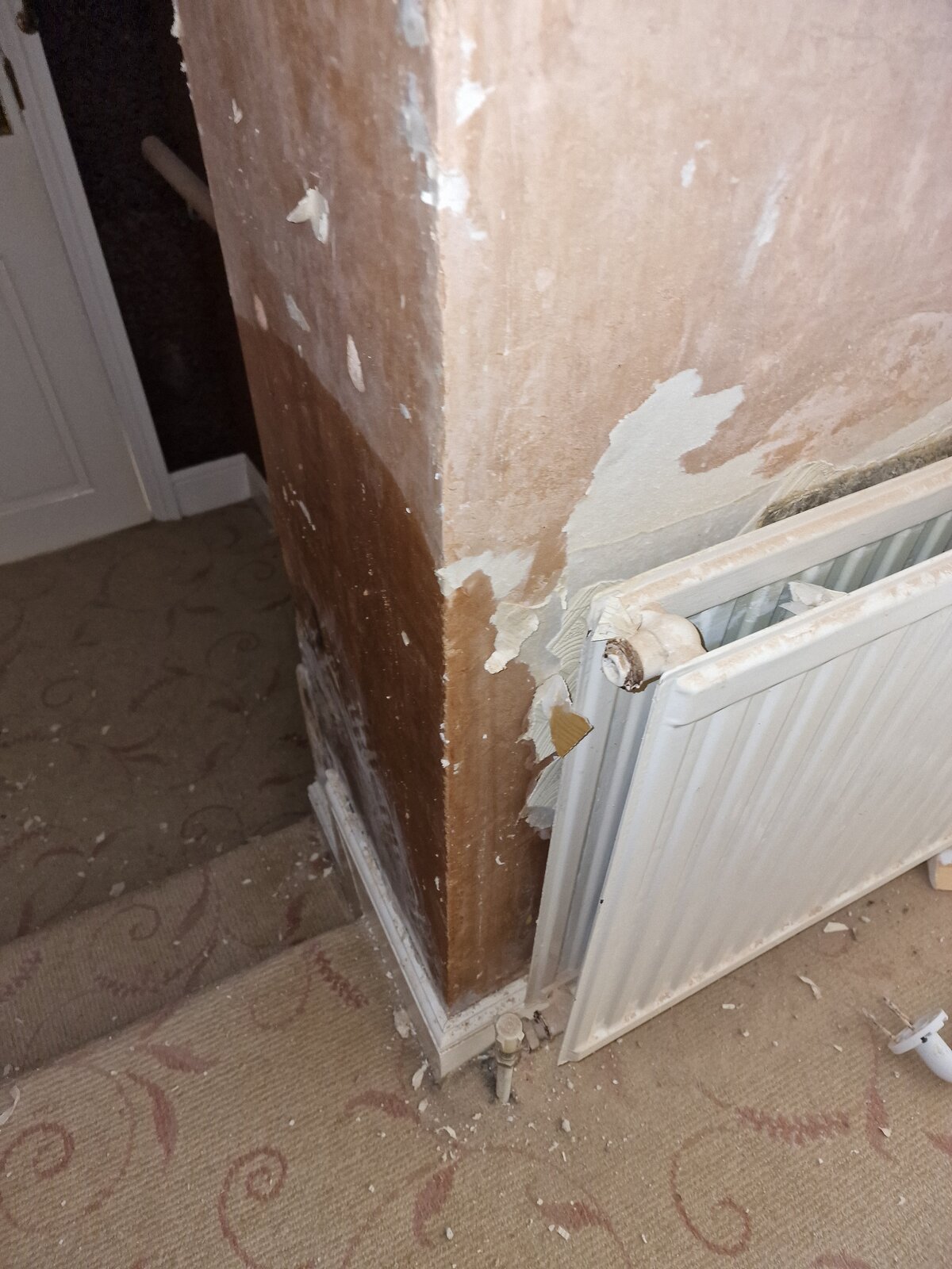We are renovating our house and found a very damp inside corner of an external wall, where the original wall of the house was knocked through to a single storey extension. You can see in the photo the wider footing of the house. Our builder thinks this is because the air brick was blocked (now unblocked) and a gutter on the outside, which is on the inside corner was dripping. It doesn't look wet where the footing is on the inside, only above it. The DPM is the slate type, which can be seen on the outside.