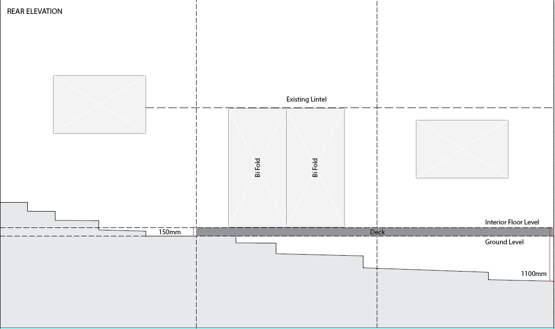Because of our sloping plot one side of the deck will be less than 30cm from ground level (highest point), but the other end will be 1100mm from ground level (lowest point).