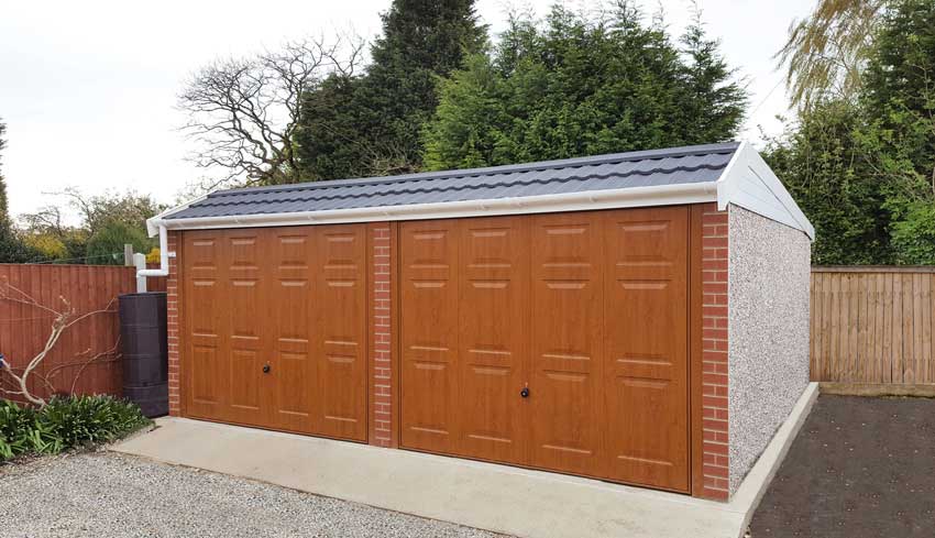 It has two single up+over garage doors, and a supporting central wall between the doors (running front to back, supporting the roof - small pitch at front, long sloping pitch to the back) (not side to side).