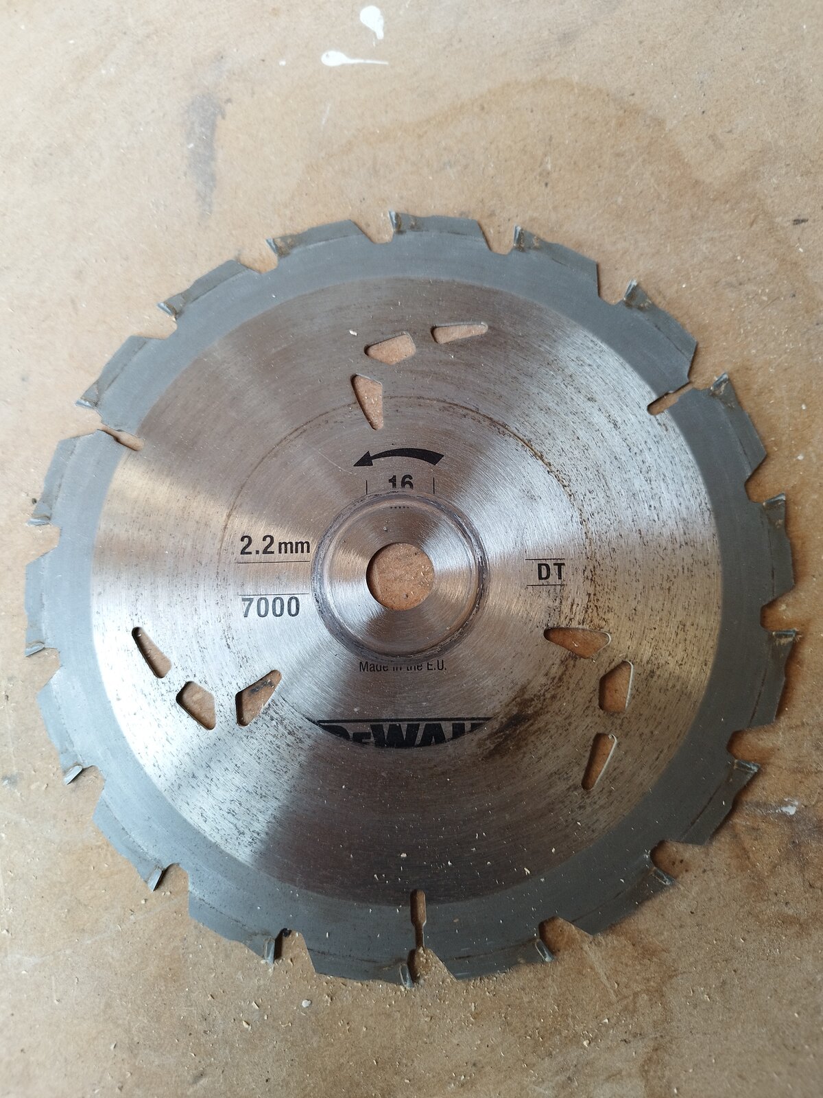 So I'll plump for it being a 184mm x 16mm bore 18 tooth rip blade with a 2.2mm kerf. Assuming that your saw is fitted with a riving knife, you will need either a 2.2mm kerf blade, or one with a slightly bigger kerf because a thinner kerf blade will probably cause the riving knife to jam in the cut