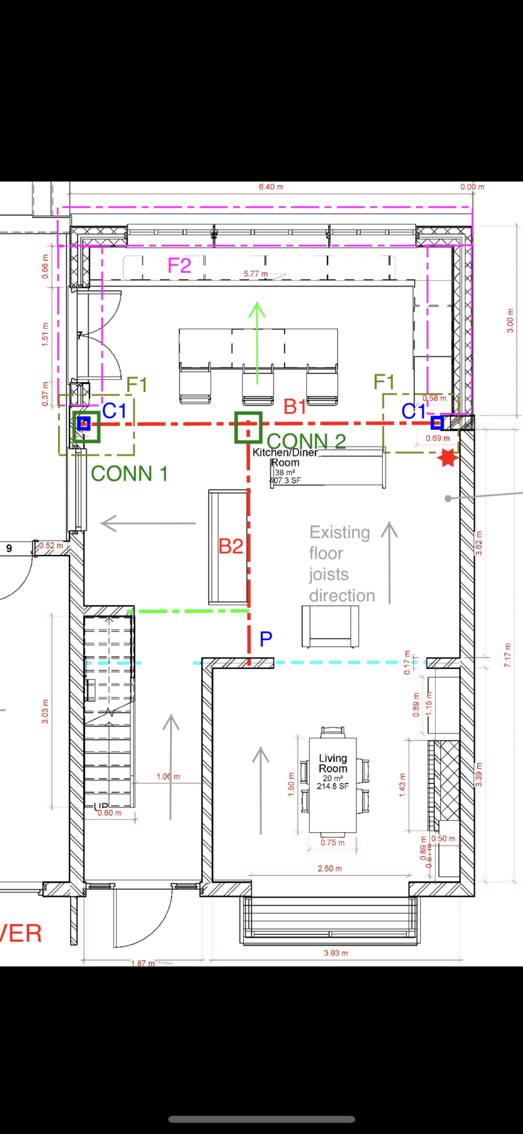 I’ve attached the site drawings of an extension i am planning to get built. The red lines are the anticipated beams. C1 and F1 are the columns and padstones. Padstone size is 1200x950x500). Purple dotted line (F2) is the new standard depth foundations (60cm wide and 100cm deep). These are the specs from my SE for the job.