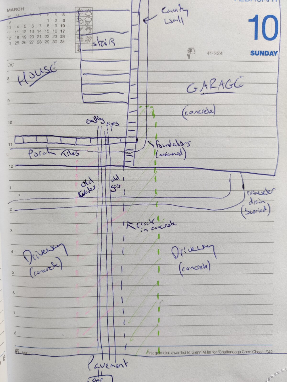 My question is, where in the picture would you advise digging the trench? Either way it's through a concrete driveway and will pass under a rainwater drain. Itll either enter the property though a small porch or through the garage. One option is to expose the current pipes and follow that line but that'll impede digging and involve digging though or under the tiled porchway to get to the foundations. Other option is to go to the right of the existing lines, dig through the garage floor and then turn 90 degrees and enter through the side wall. This will involve a bit more digging though concrete and possibly more fiddling to get it through the wall. Do you think the water or gas companies will have any issue with either?