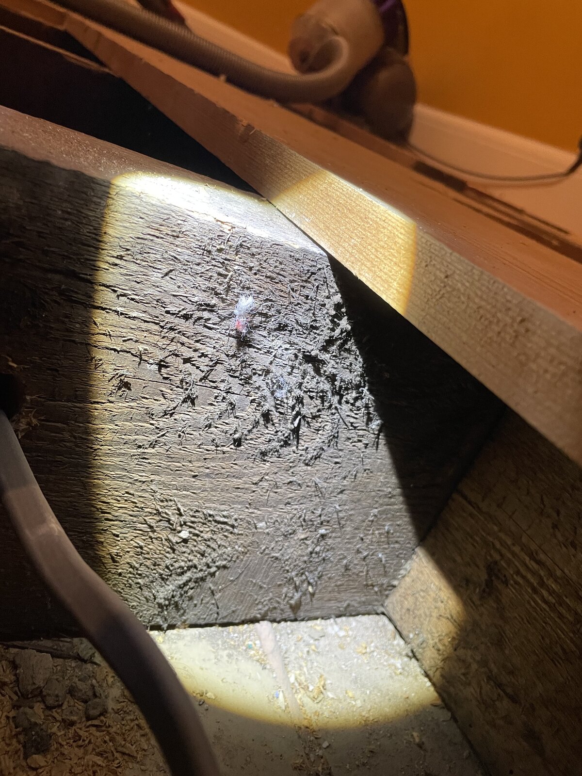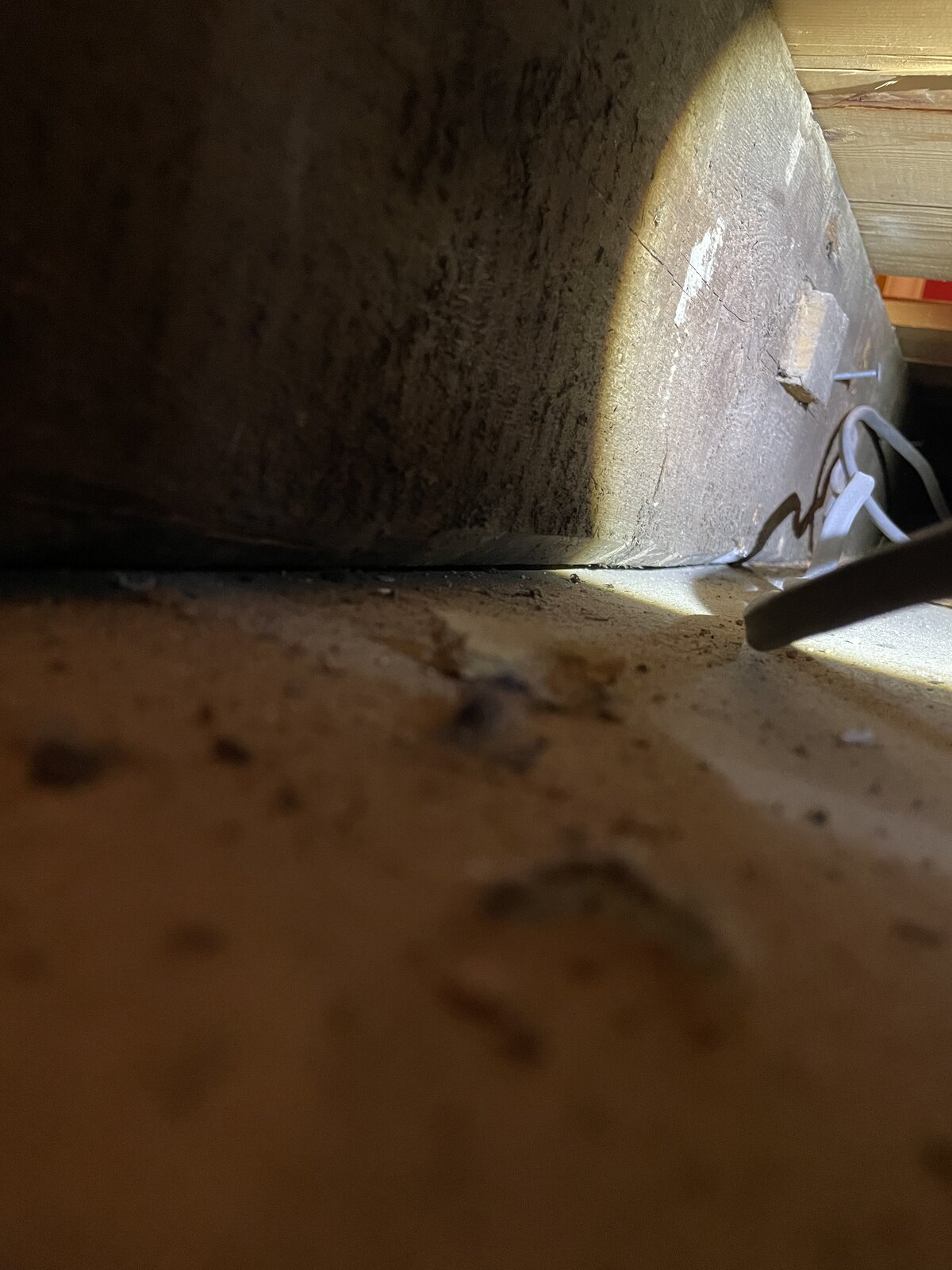 The big gap (2AA2D) comes from how the concrete of the hearth is higher on the wall end than the other, explaining most of the dip. But the concrete is level on the lowest end still with its frame, so doesn’t seem to be slipping (could also slide a piece of paper underneath it from the joist, so the hearth isn’t touching the ceiling). The hearth frame (8AD3) is also diagonal under the floor board, but I measured it in the manner of 9A97 and, as shown in CF852, it’s straight so might have been cut diagonal at the top for some reason?