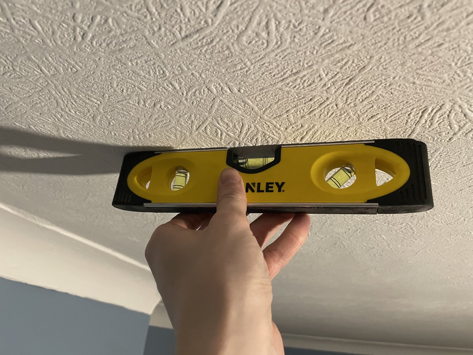 Try your level on the celling below. Also what is that room? just a bedroom?