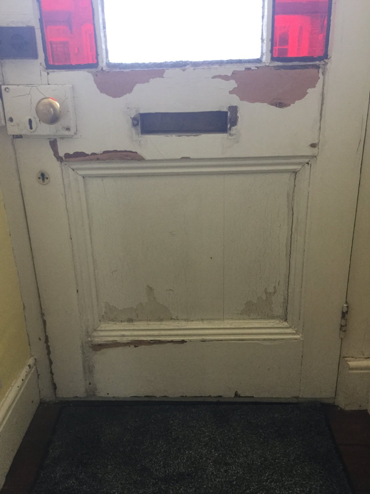 Our front door is badly in need of TLC. Multiple layers of old lead paint which have broken off. Badly filled gap in wood.