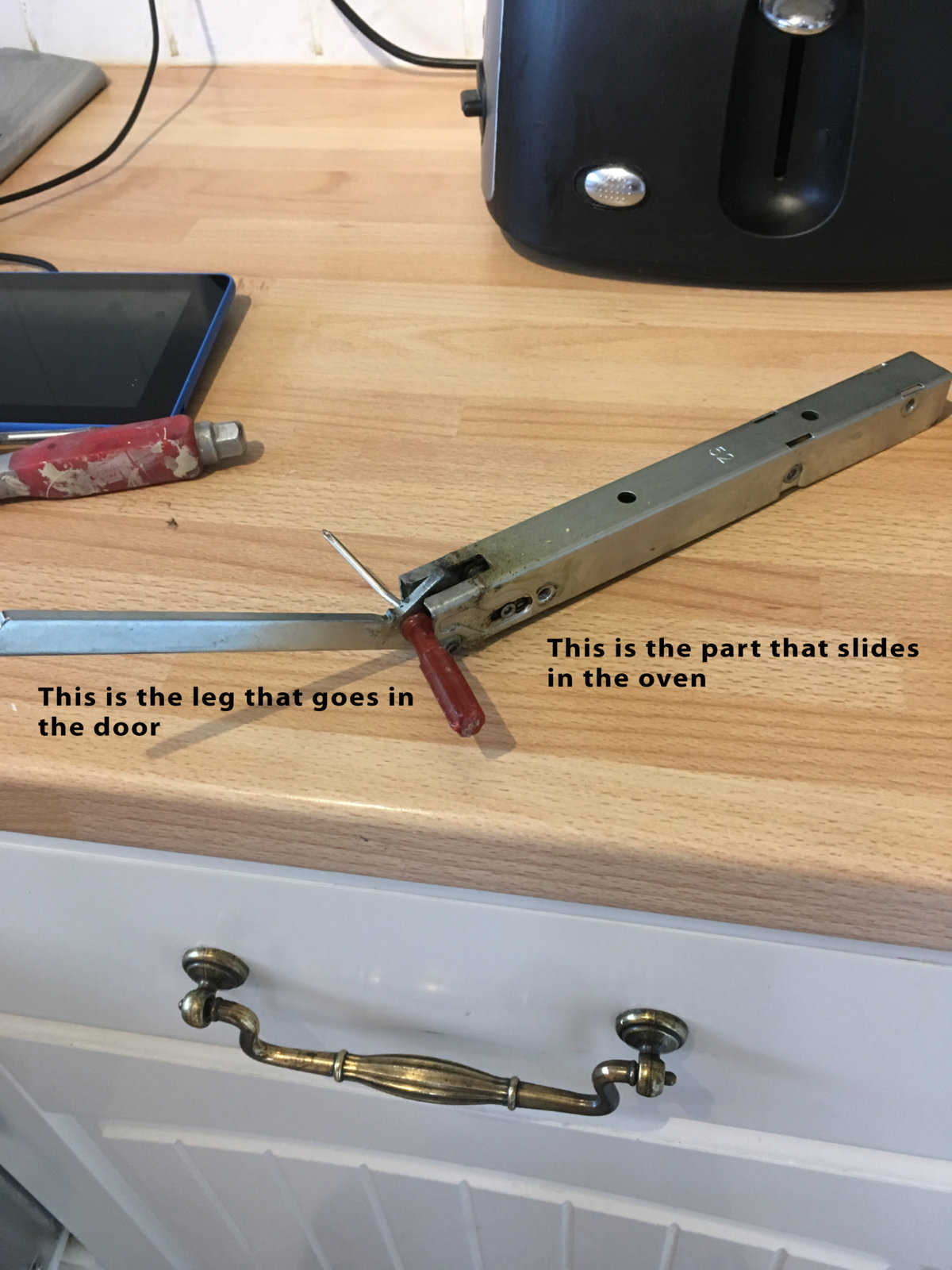 remove these screws then slide the door back. On the hinge joints there are holes. I put a small screwdriver in to stop the legs springing up. Then slide the door off completely.