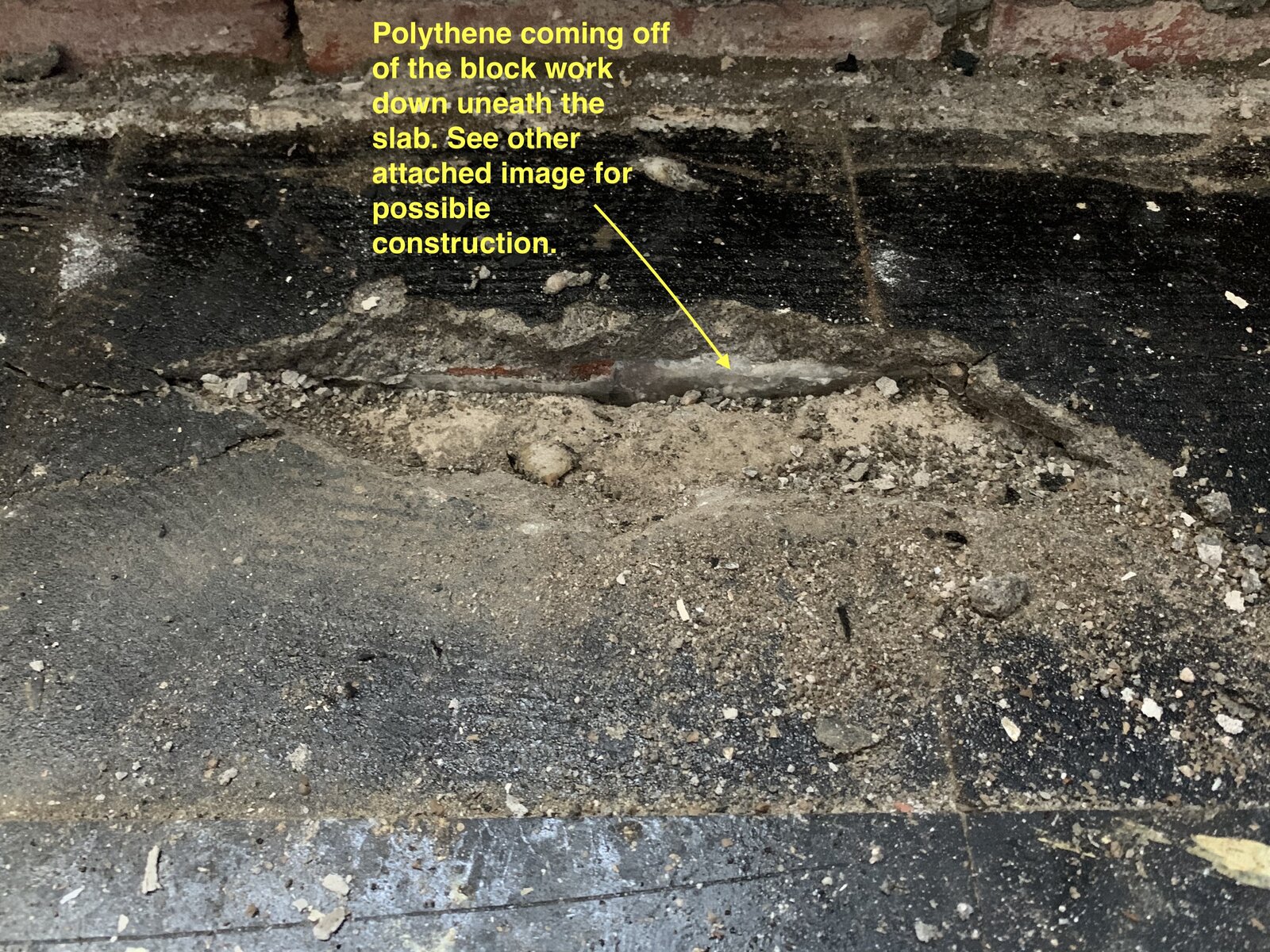 I have also lifted the lino flooring in the dinning room. One or two of the tiles have popped so I removed these and some of the concrete was cracked so I decided to break of bit off. I found what looks and feels like polythene (image attached). There was no smell or sign of moisture. From the outside of the property I can to the black DPC. At the moment I feel pretty confident there is a DPM underneath the concrete, I just want to ask what people think and that the evidence i'm seeing should be enough to confirm a DPM and the bitumen marley tiles are not.