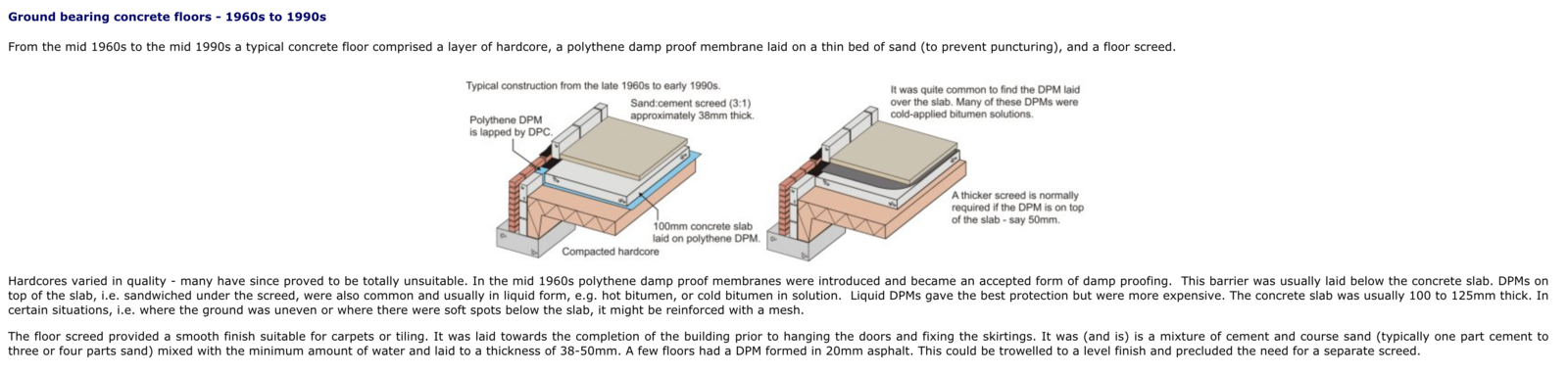 My property was built in 1965, my suspicion that the marley tiles are not the DPM is due to the fact there are no marley tiles underneath the kitchen cabinets (just concrete) and none under the existing floor in the downstairs toilet and bathroom.