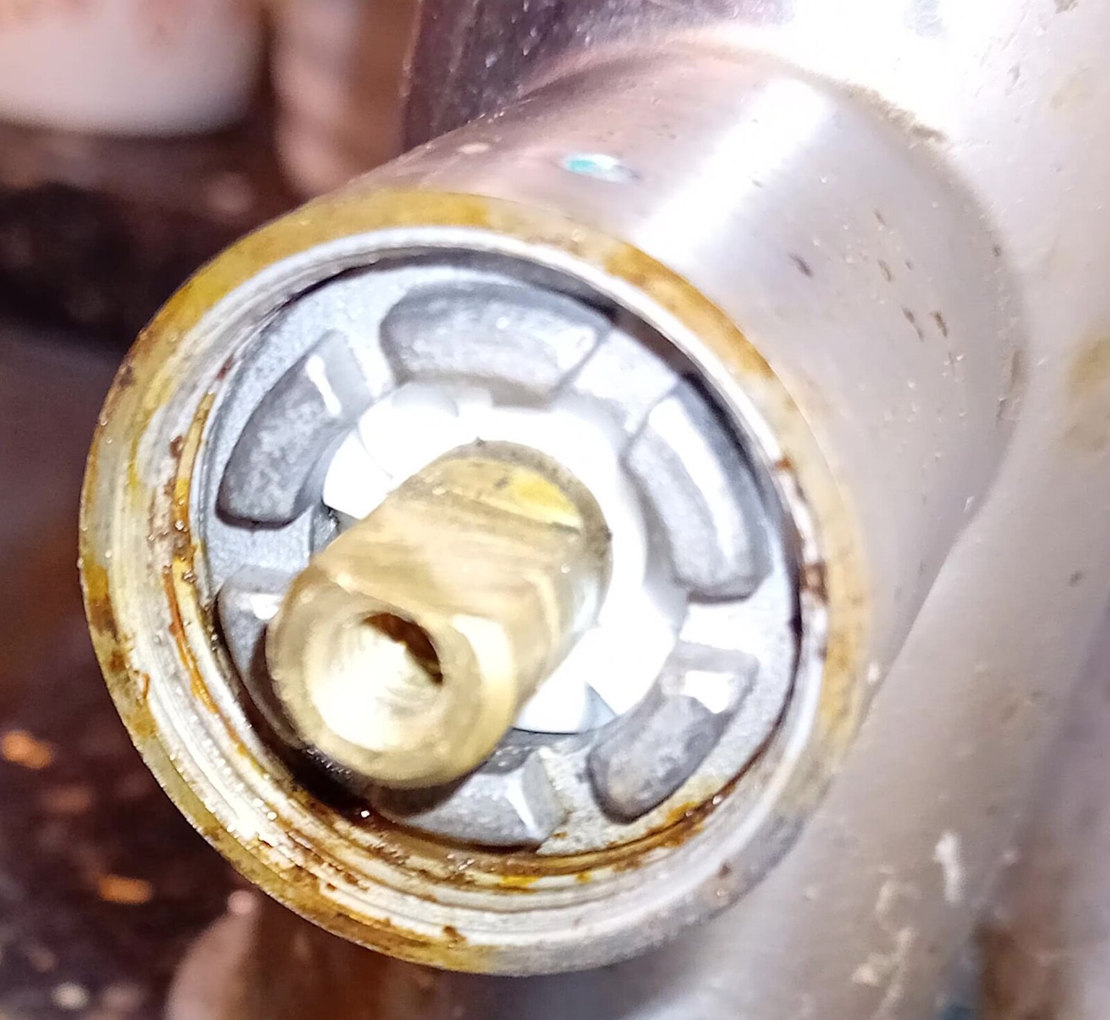 Leaky kitchen tap. This is what I've managed to expose of the valve so far. The rest of the metal is solid (welded). The tiny mark on the top is where the colour dot (hot / cold) is and is solid. Clearly I either need to expose more of this valve somehow or maybe I need a special tool.