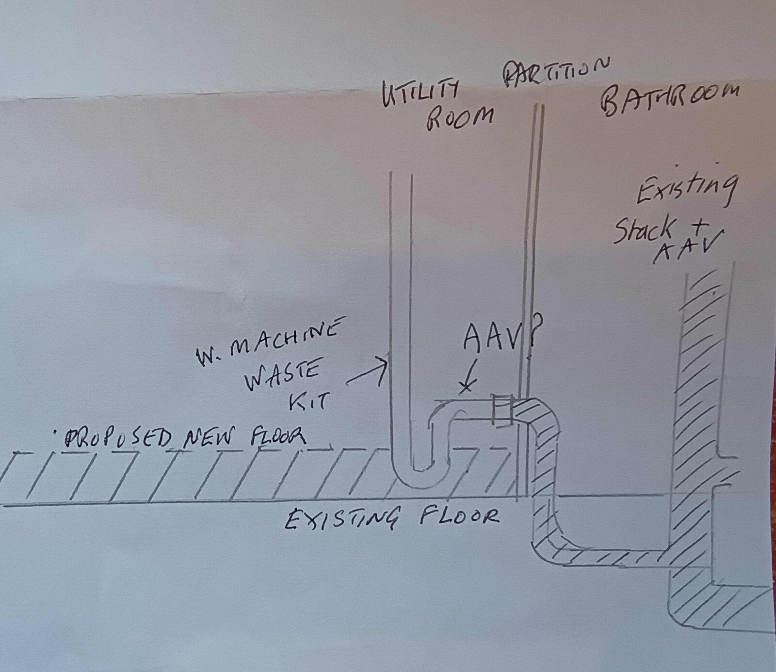 The shaded area is how the team of builders that built the bathroom section, which is an extension on a beam and block floor, left things. I am not precisely sure of the below ground arrangement but they did put in the soil stack as shown. There is a shower and w c not shown. The w. machine waste actually joins up with the shower waste before joining the soil pipe.
