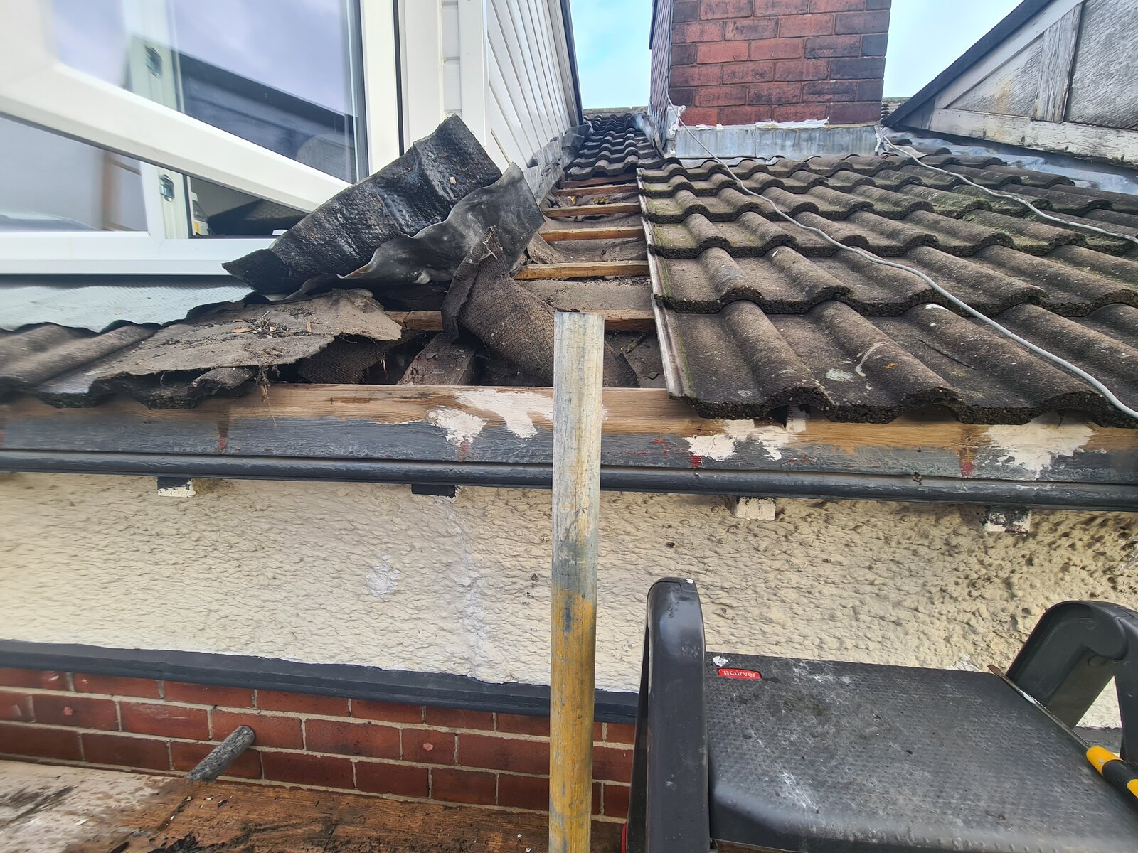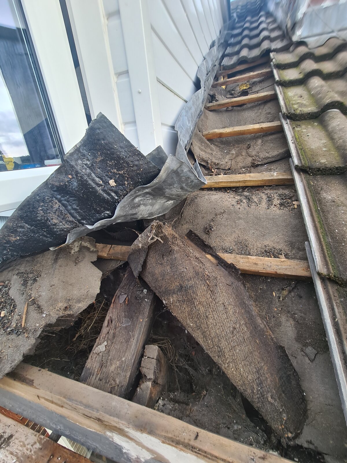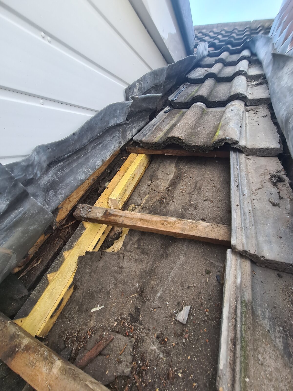 (On the pics - there's extra wood - a roofer added these as a temp fix just to hold up the roof tiles until we could get the joist fixed - on our request.)