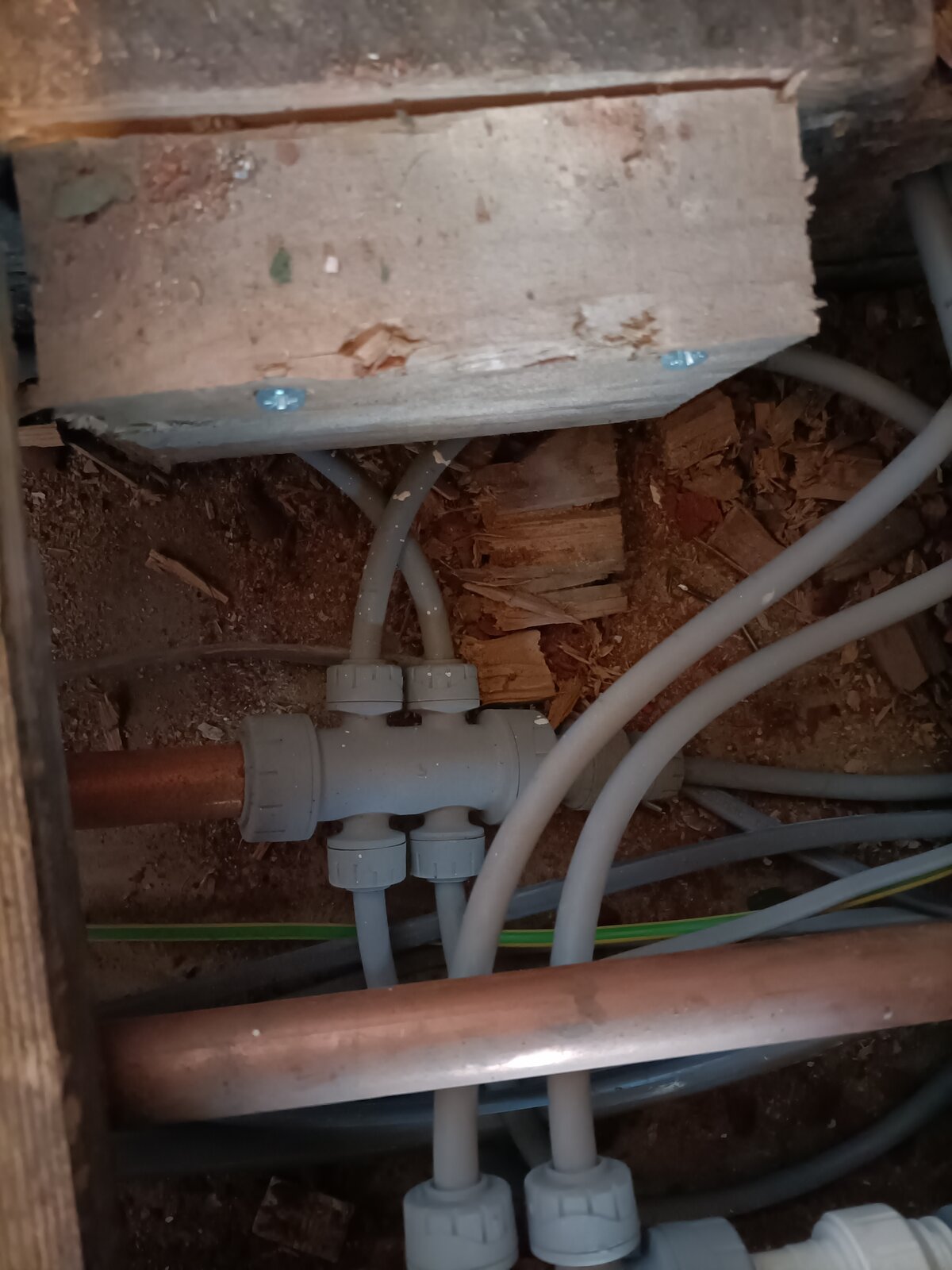Then another return flow with another 5 pipes coming into it, with both connecting to a larger (22mm?) Pipe which comes from the boiler.