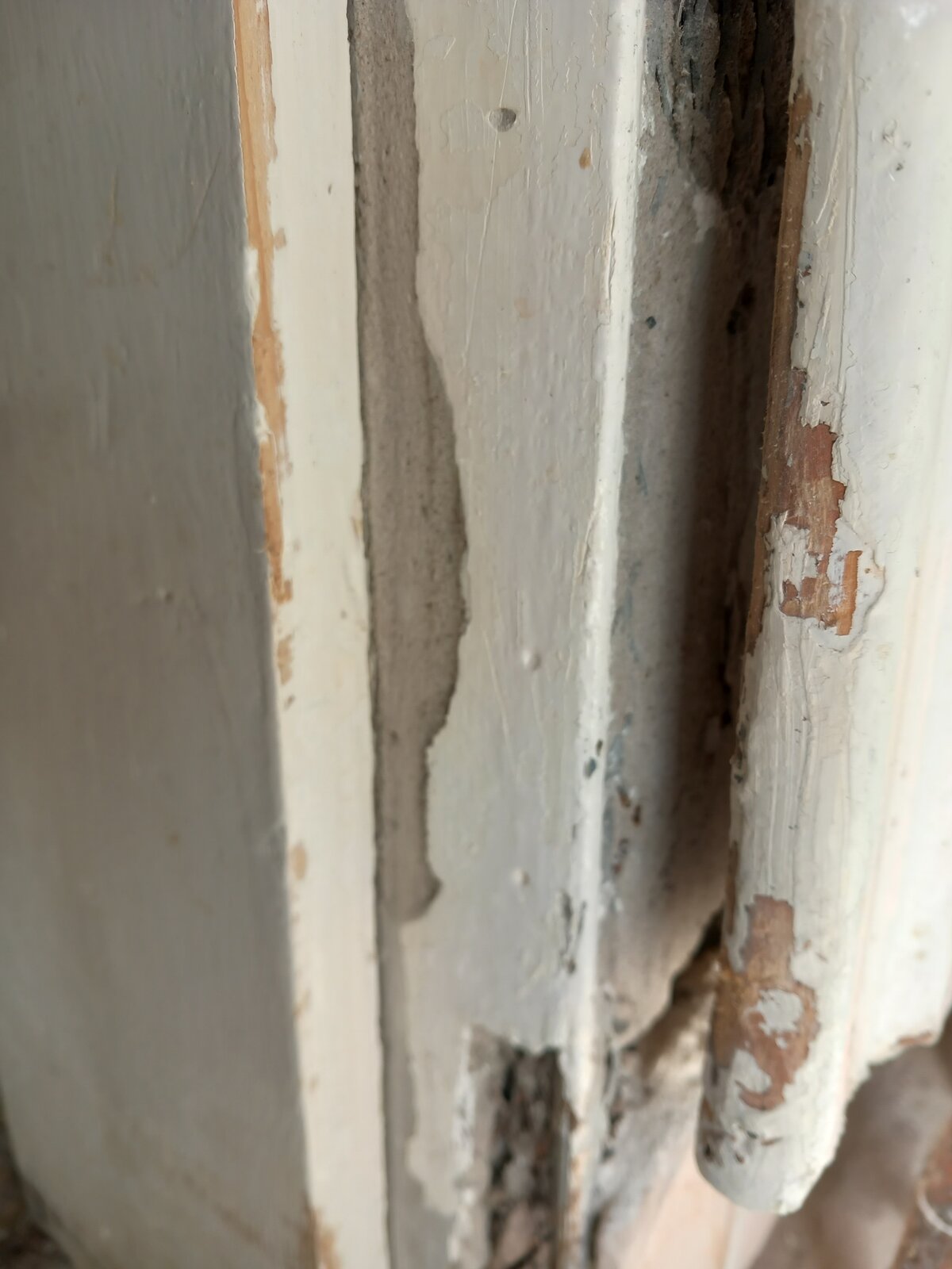 It has a wooden frame, with a sand/cement edge (painted over) and then has wooden architrave attached to the send/cement. See photo.