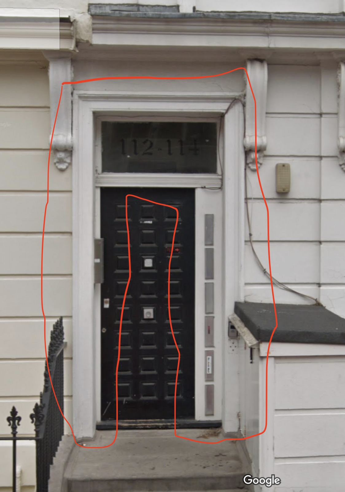 I'm painting a "doorway" in a Georgian terrace, I want to paint the whole "doorway": the frame, the bit at the side where the letterboxes are and the stone bit that frames these parts - its got the intercom box on it. I'll paint the actual door later (black) but for now its the areas around it.