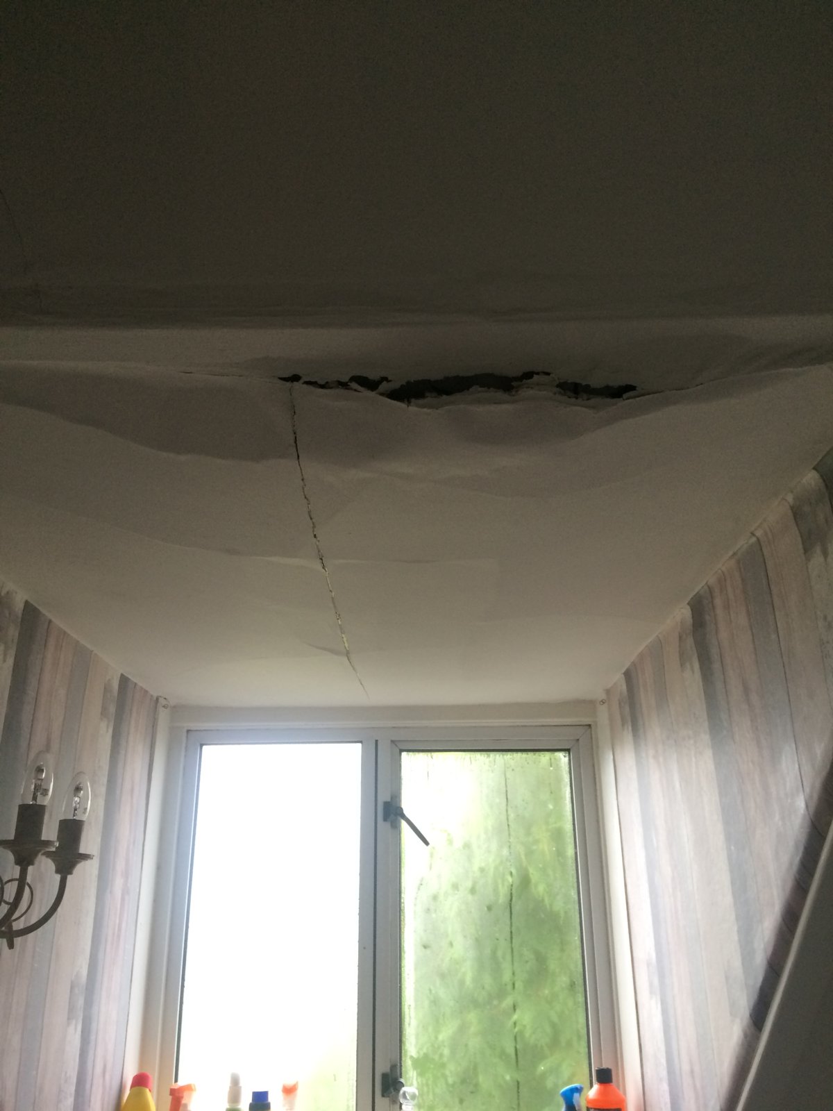 I have a dormer window in bathroom with flat roof. The ceiling of the dormer is coming away but there is no wetness and roof looks ok from outside. It looks like the plasterboard (?) is about to come away and im unsure whether to phone a roofer or builder/decorator. Any advice much appreciated. Photo attached hopefully.