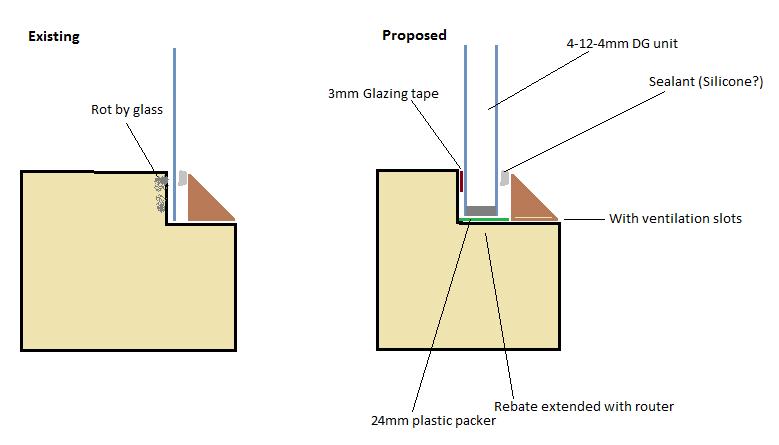 I am thinking I can remove the glass and run a router & chisel around the frames to increase the rebate and remove the rotten wood. I would like to then install a 20mm overall double glazed unit. As far as I can tell they can be positioned on top of 5mm thick packers and stuck to the inner face with glazing tape. After this install new exterior wood bead and run some sort of (silicone?) sealant around the gap.