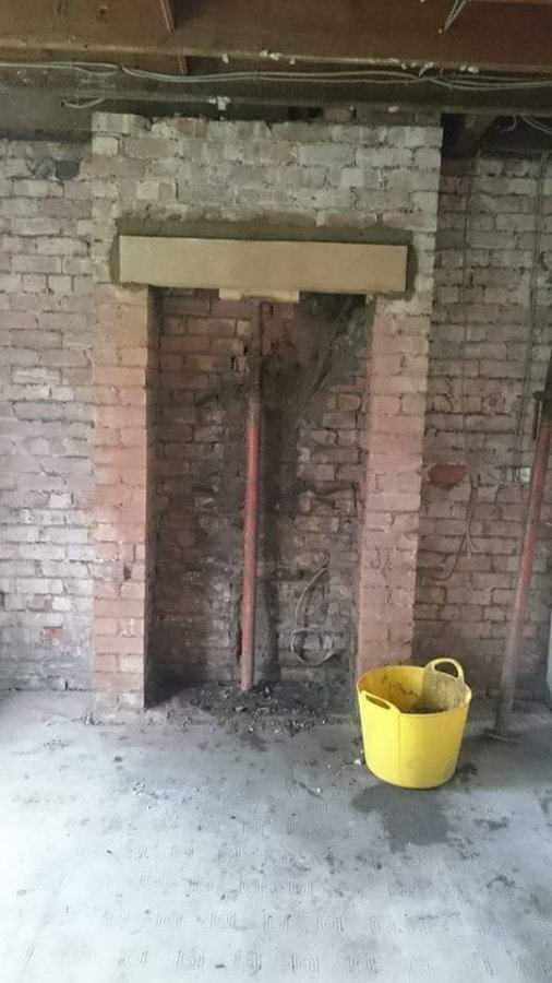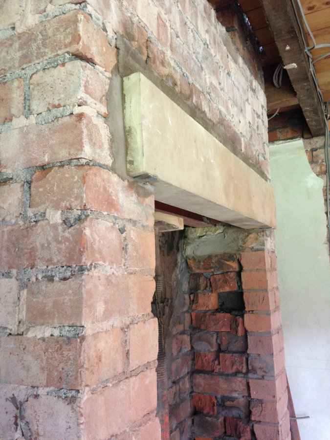 We've just started renovating our house and one of the first orders of business was to open up the old chimney ready for a range cooker. We used acrows to support the brickwork and opened up the space. We installed one concrete lintel across the space.