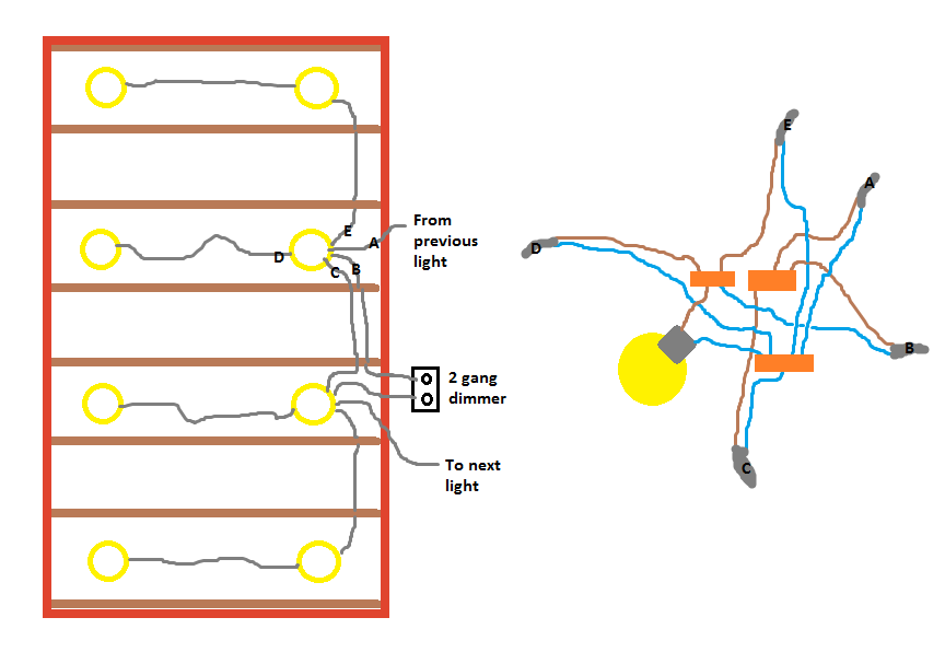 Hello, I want to install some downlights in a grid pattern with 2 independent zones. I was thinking I could do it as shown attached, is this OK? Online resources seem to suggest junction boxes are required. Can't the connections just be done in the light fitting terminal blocks?