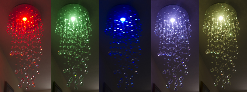 the centre bulb is a colour changing dimmable bulb, and the outer bulbs simple GU10 LED's and it has a smart relay so I can select centre or outer or both. It is because we want loads of light on the landing at times, but also a dim light so as not to wake people switching on light, and the colour changing does look nice, and one would have a problem getting them all to change together.