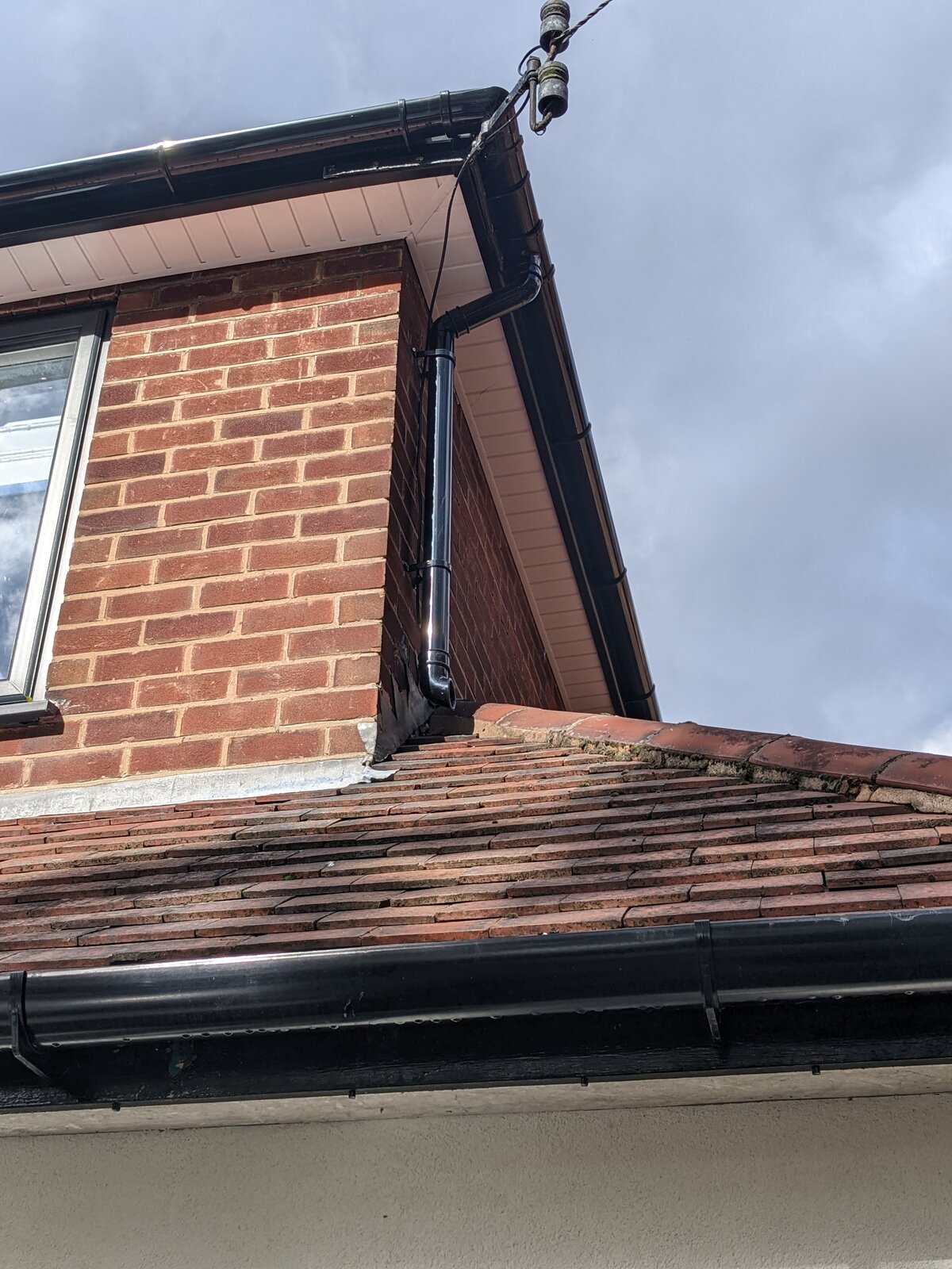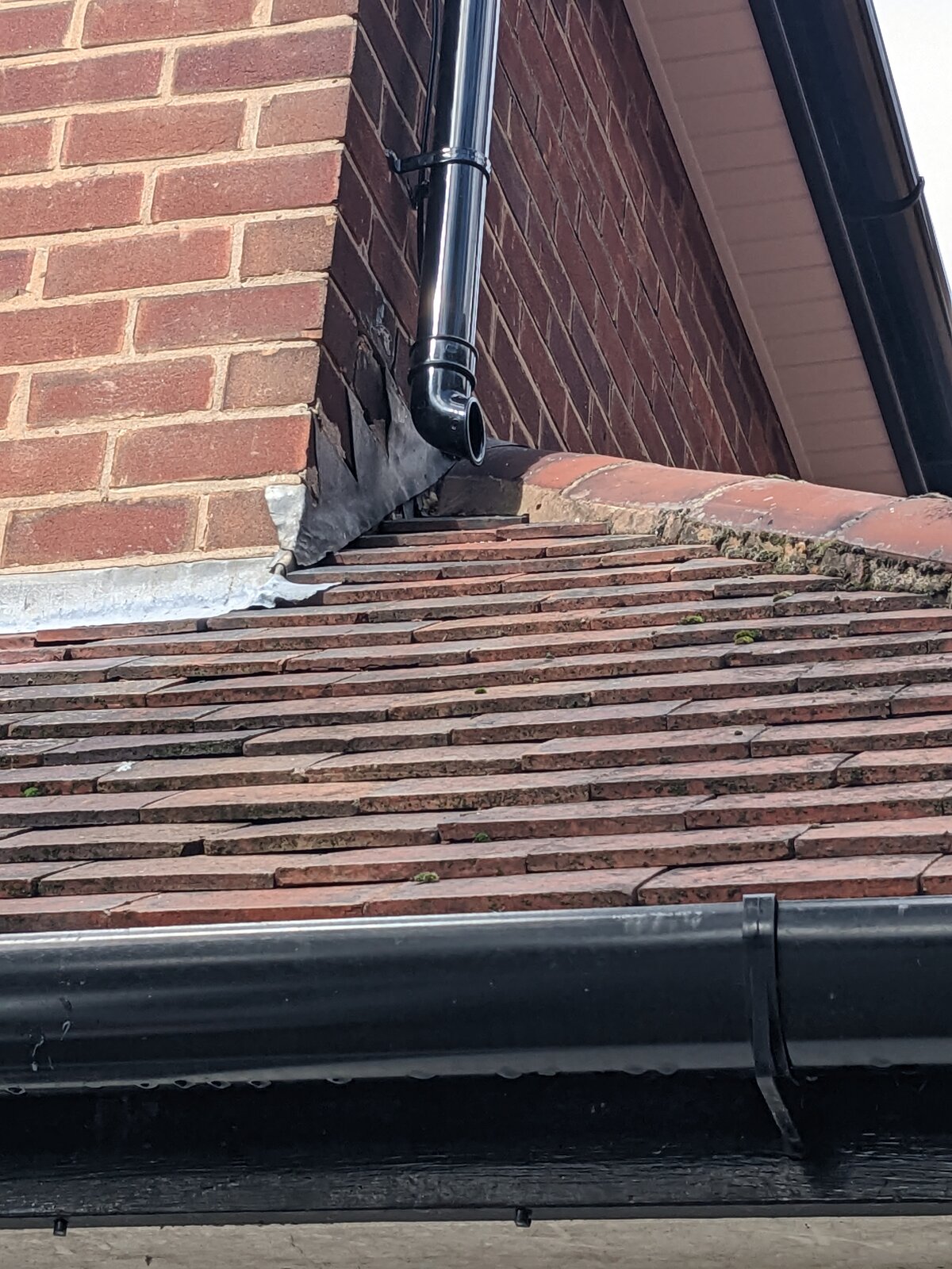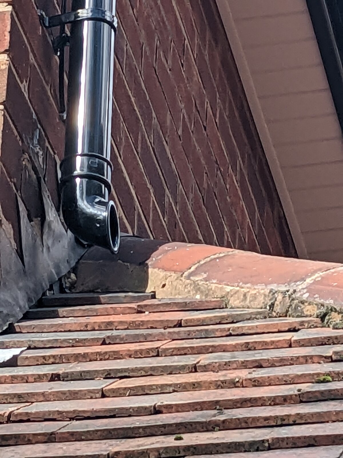 Noticed that in the rain one of the downpipe shoe drains water with a fair amount hitting the ridge tiles. I am worried the drainage might burden the ridge joint and eventually leak.