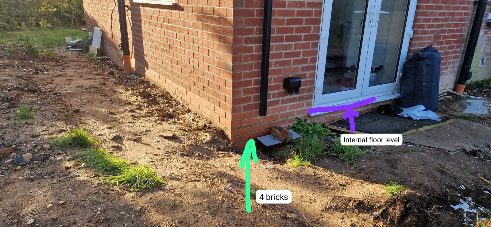 Internal floor level is 2 bricks above engineering bricks where the french door is but 4 bricks if you check from the sides of french door.
