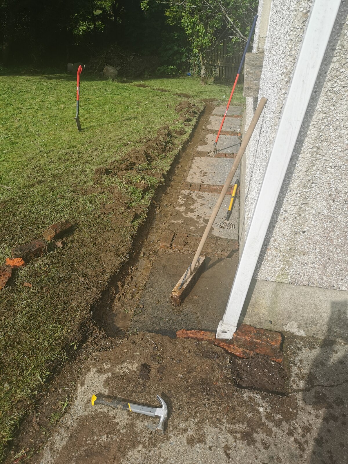 I've dug a bit of a trench today for water to drain away. I was thinking of moving the path to the left and adding decorative stones under the garage wall to help with drainage and adding a gulley under the gutter pipe and run the pipe under the trench I've dug into the garden? Or I'm more leaning towards a pipe from the gutter into the channel drain and just let it come out into the grass.