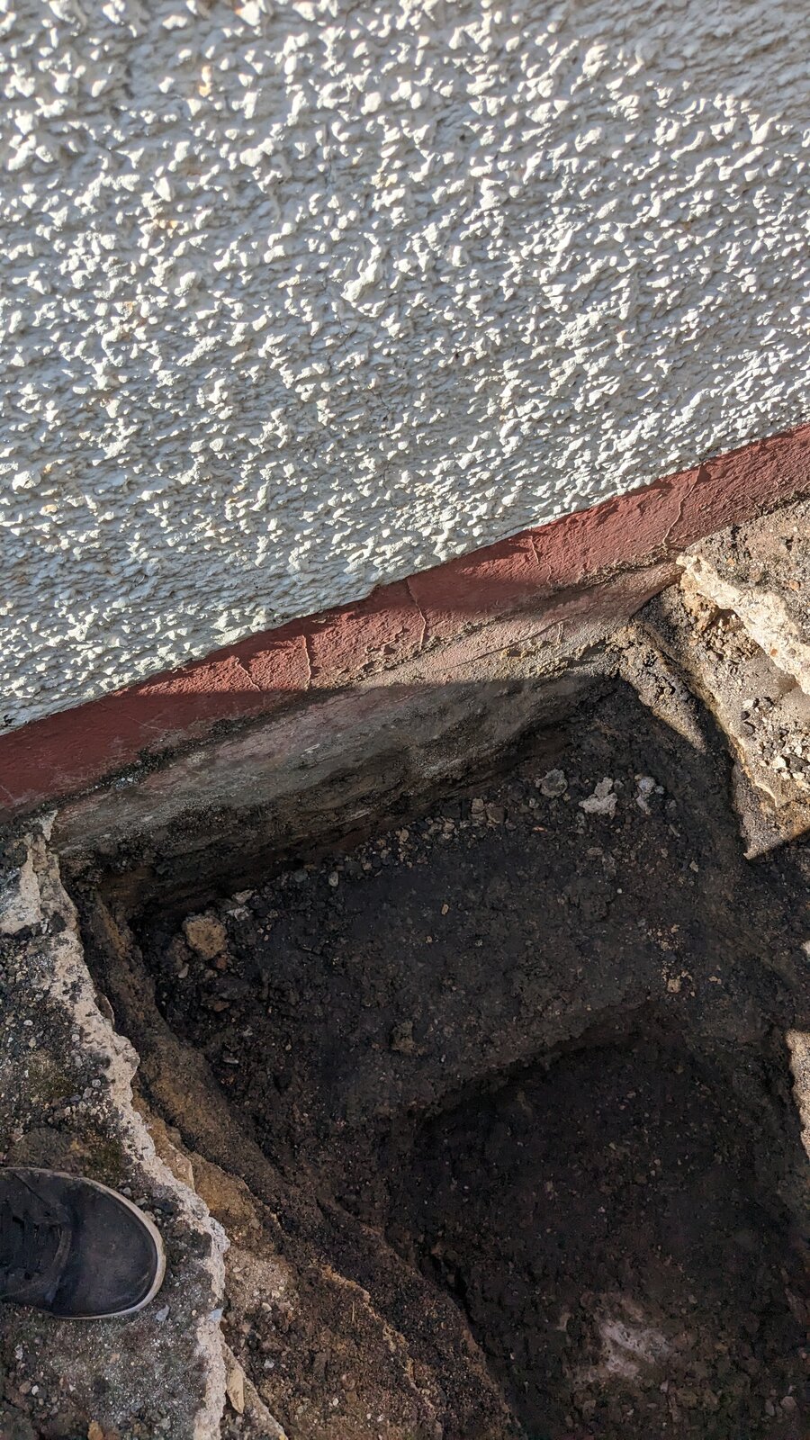 He asked me to get builder to check the depth of the foundation of the existing structure to see if it needs underpinning. When the builders dug it seems like there's some sort of step concrete foundation that stretches to my fence.