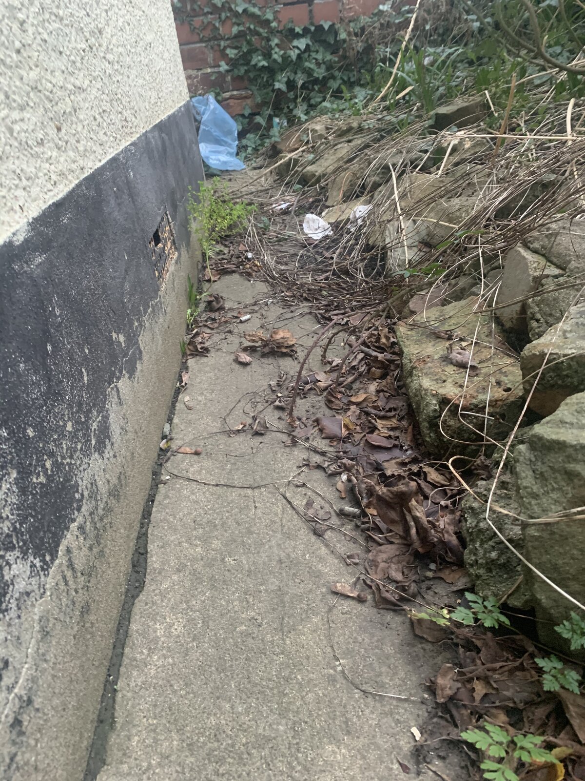 at the front (raised side) the path has sunk under the bay window below the level of the drains (either side)