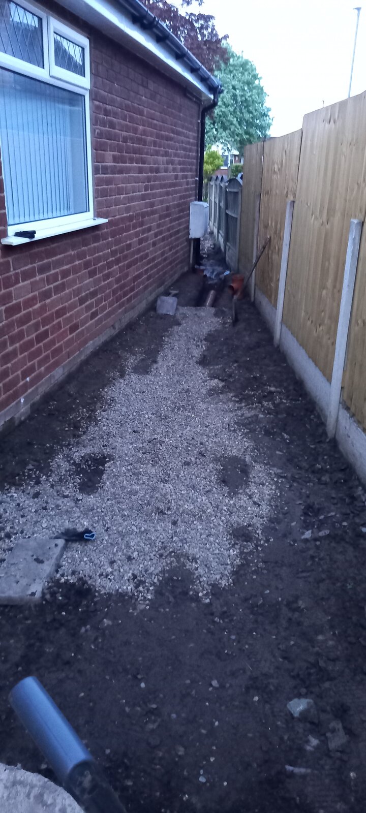 I've had this drainage pipe installed down the side of my house to remove excess surface water from front garden to rear garden area where it drains much better. The pipe has some perforations in the top half to also collect water from down the side which would get some pooling in rainy conditions. The bottom of the trench is probably 6 bricks below dpc at the point nearest on the photo, going up to about 4 bricks below further away. The trench was filled with pea gravel, membrane over the top, and finished in a few inches of gravel, the top of which finishes 2-3 bricks below dpc from one end to the other. The trench will get water in it when it rains although the pipe will carry some of that away if it fills up...