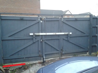 Need to sort my driveway gate out, it normally locks at the bottom into some holes in brick but the bricks are always breaking when i bring my car in, is there any harm in digging up the bit in red all the way across and cementing in a wooden beam bolted in at each post ?