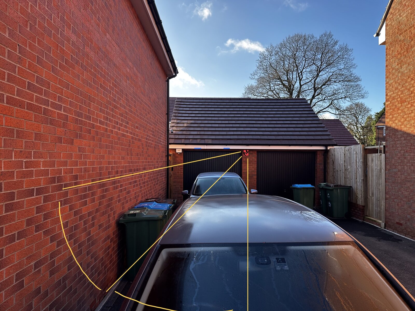 Now I am replacing the floodlight, I have a revised plan to hopefully improve detection on my side of the shared driveway. I would like to install a new floodlight without a PIR in the existing floodlight location - most likely a 30W as the current 50W is too big for the height its at and seems unnecessary. I plan to install a PIR sensor (like this) on the right hand side of the garage, underneath the soffit, which I can turn towards my side of the drive to minimise activation by neighbours. It would be good to have a PIR that has an override facility as the way its wired it will be on PIR or off. I'd like to avoid changing to a two gang switch to provide the options of ON/OFF/PIR. A minor issue I foresee with the PIR is I wanted to feed the cable through the bottom of the soffit and into the PIR, rather than through the wall, as the cable will all be fed along the soffit to get to the PIR and then back across to all 3 lights. I can't find a PIR with top cable entry that also swivels horizontally.
