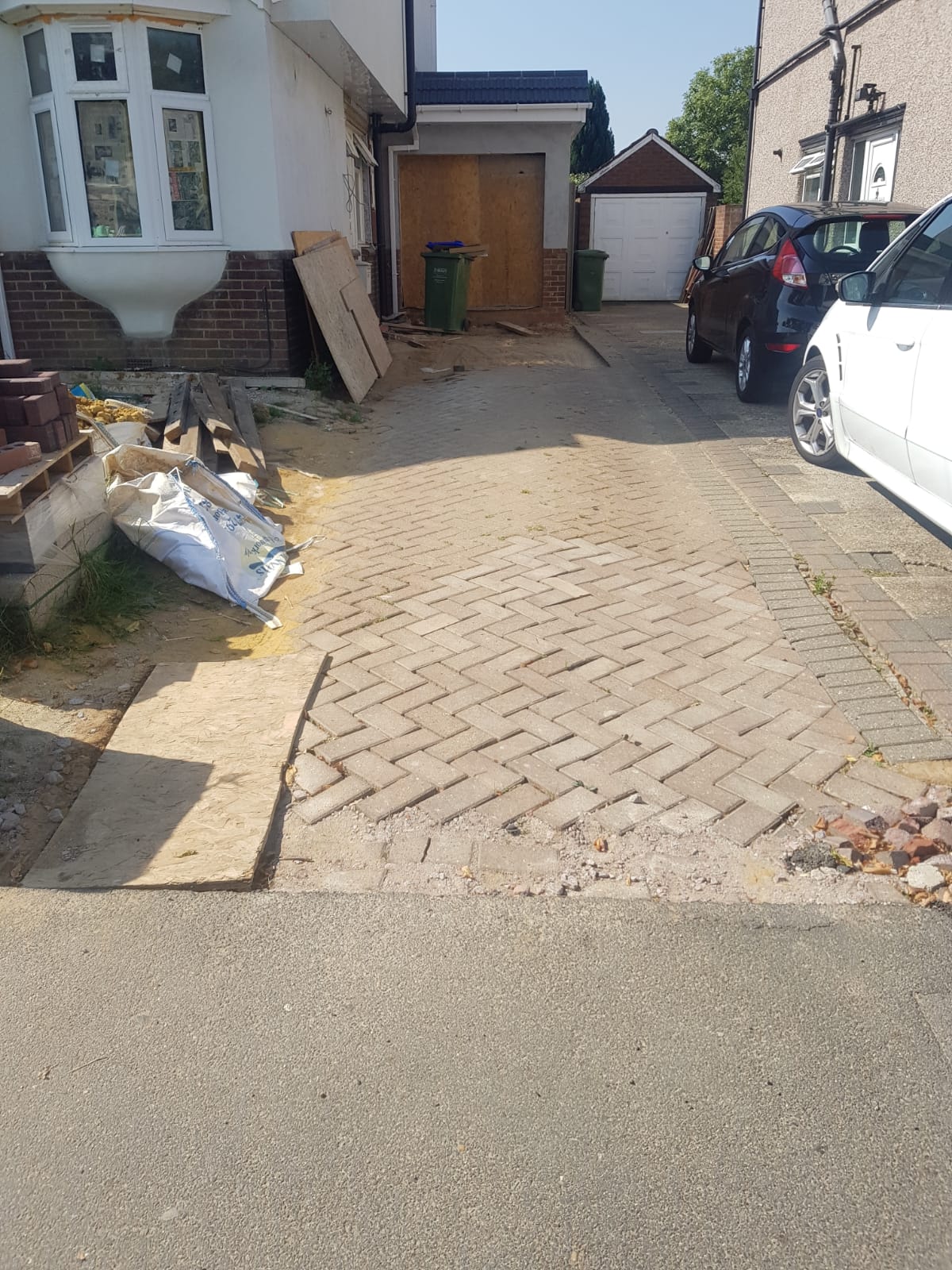 The driveway there before was been there for some time now, it was done before we moved in, how long ago, I dont know. It was dipping in a small section but that section has now been built upon, so it doesnt matter. Some of the block paving got taken off and we are now left with the sharp sand and what looks to be some mud dug out from the ground during drainage works.