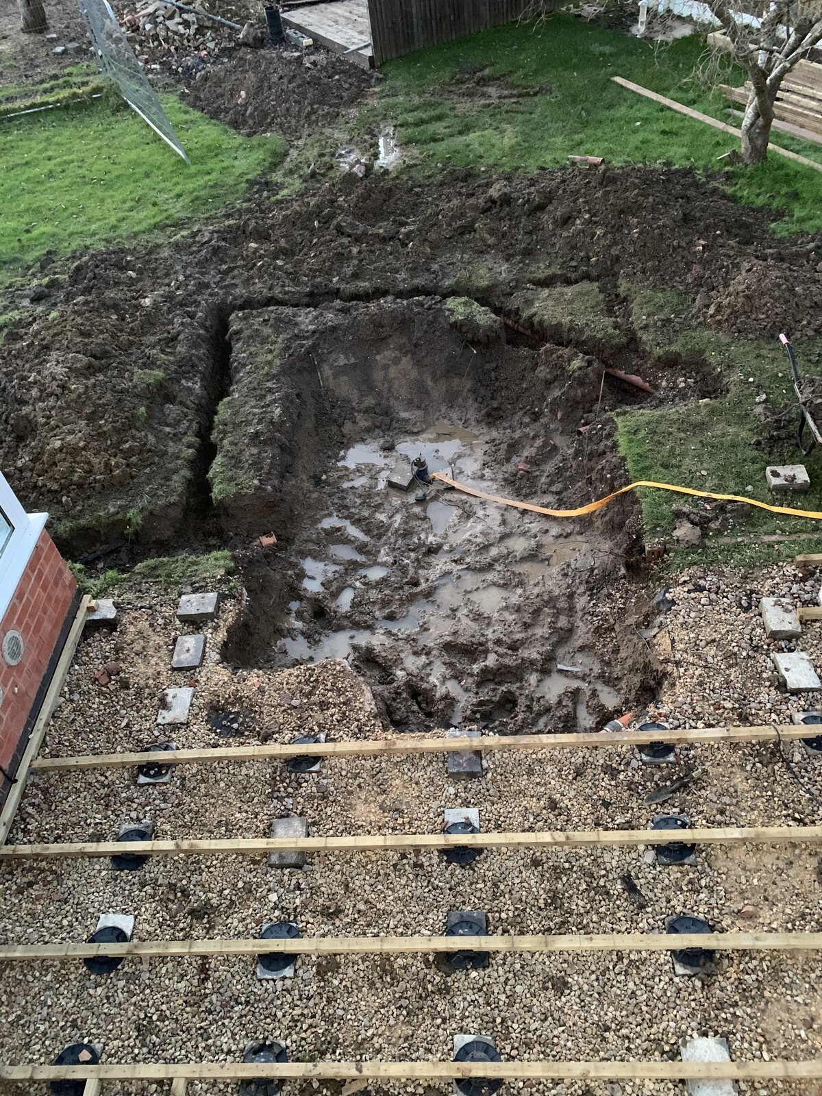 I have dug a hole aprox 4 x 2.8 meters and hit a gutter pipe drainage on the way which I’m digging around to reroute. It’s been very wet over the past week and caused water levels to rise in the hole a little out of control. I have tried draining it as you see in the picture, this works but hours later there’s about 10cms more until it settles l suggesting a high water table.