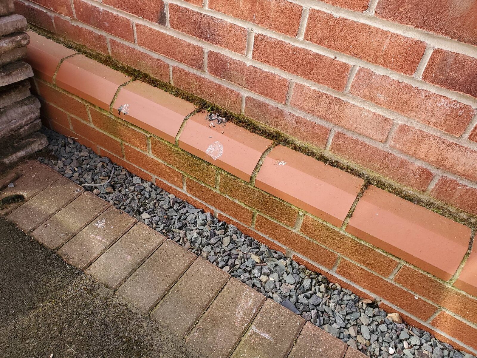Why is it there? Again, I think from the posts here, it makes sense that because the two houses are on a slight slope, rainwater flowing right to left in the photo, down the neighbour’s driveway and into this house, hence the need for an additional barrier, perhaps because the DPC was too low? I’m no expert but I presume the DPC is on top of the black bricks, so significantly higher than the neighbour’s driveway, or below the black bricks and therefore just slightly below the neighbour’s driveway?