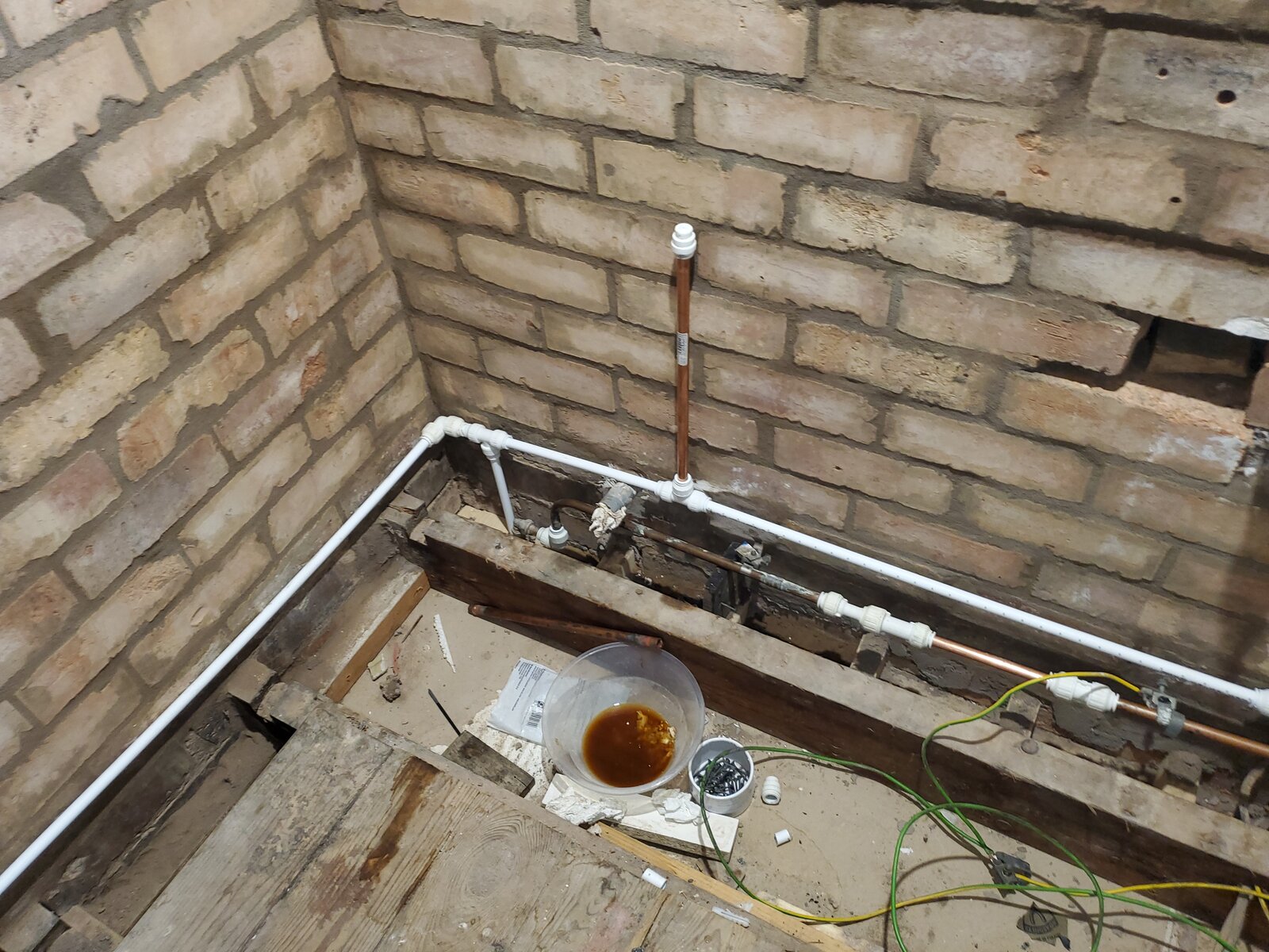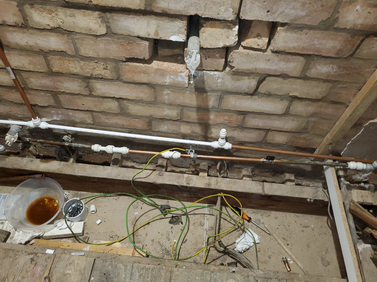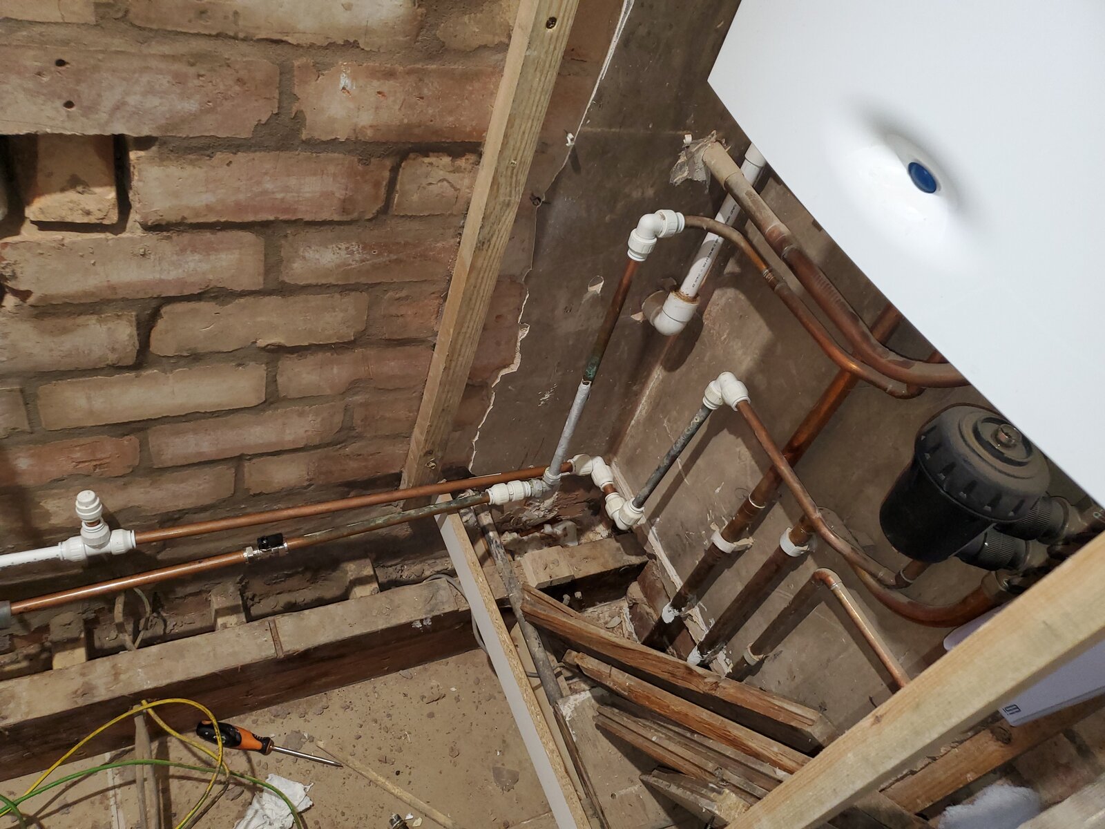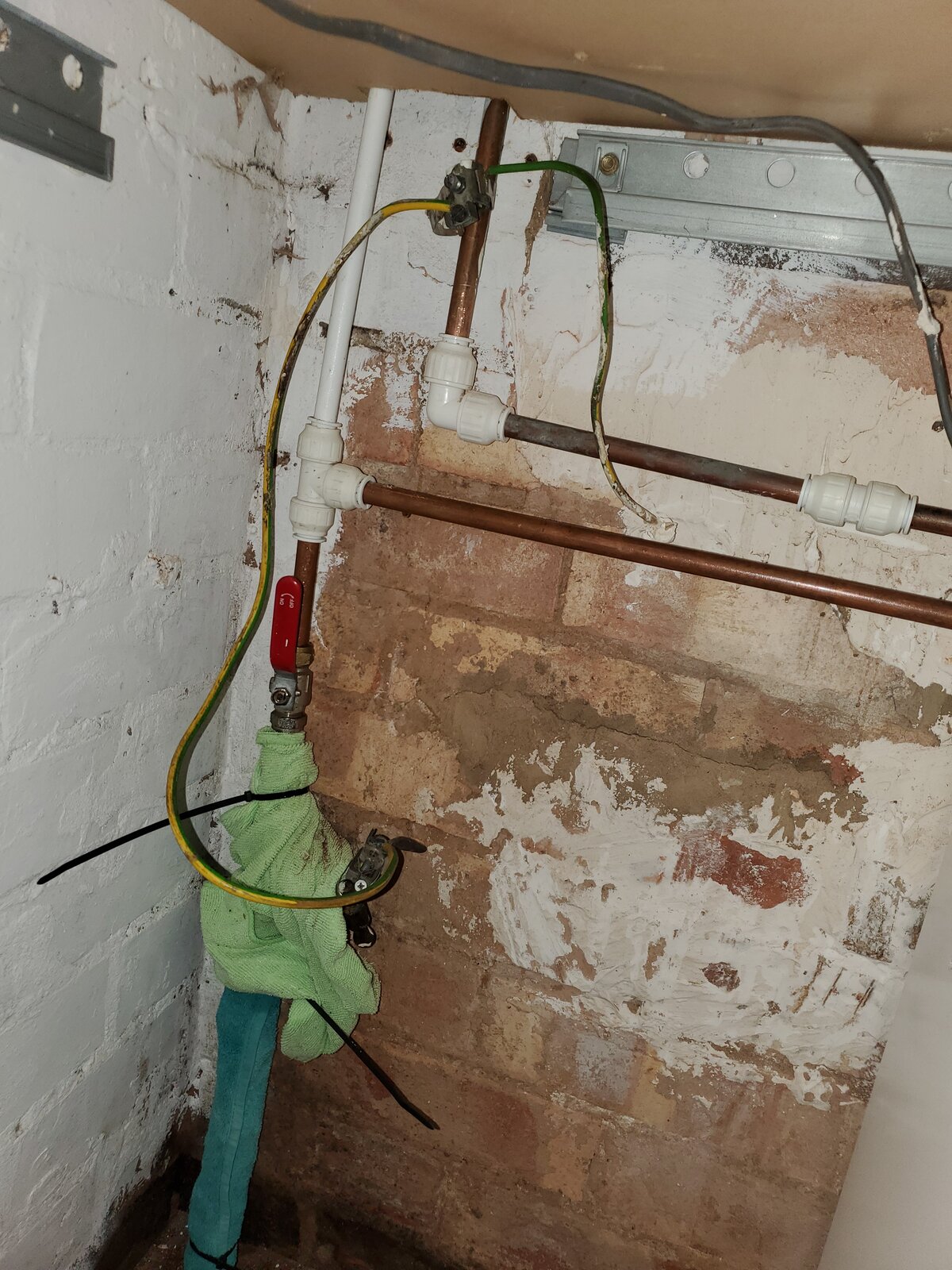 I've been renovating my bathroom and the kitchen below and started replacing some old copper water pipes with plastic. The old lead main and stop cock remain along with the odd bit of copper (i ran out of plastic pipe). The hot water is still all copper although most of the fittings are plastic pushfit.