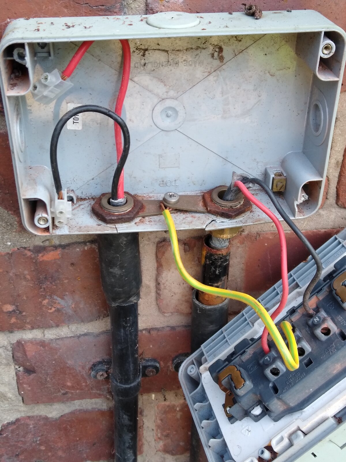 I had another look at my outdoor socket recently (posted about previously but still not replaced!). One of the issues with it is that the indoor 'PowerBreaker' RCD trips often regardless of what's plugged into it (consequently we don't actually use the socket). I noticed that it's earthed via the steel duct that the mains is fed through (see pics). Or at least that's how it appears to me. The steel duct on the right goes into the ground and the mains cable comes out in the void under the floor. It comes up in the under stairs cupboard where the RCD resides. Is earthing like this normal and might it be the cause of the constant tripping?